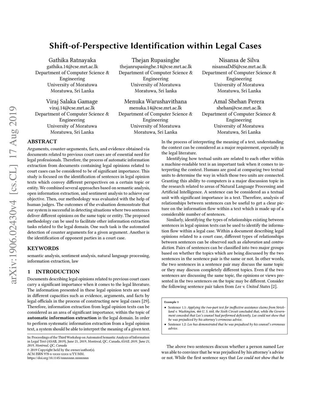 Arguments, counter-arguments, facts, and evidence obtained via documents related to previous court cases are of essential need for legal professionals. Therefore, the process of automatic information extraction from documents containing legal opinions related to court cases can be considered to be of significant importance. This study is focused on the identification of sentences in legal opinion texts which convey different perspectives on a certain topic or entity. We combined several approaches based on semantic analysis, open information extraction, and sentiment analysis to achieve our objective. Then, our methodology was evaluated with the help of human judges. The outcomes of the evaluation demonstrate that our system is successful in detecting situations where two sentences deliver different opinions on the same topic or entity. The proposed methodology can be used to facilitate other information extraction tasks related to the legal domain. One such task is the automated detection of counter arguments for a given argument. Another is the identification of opponent parties in a court case.