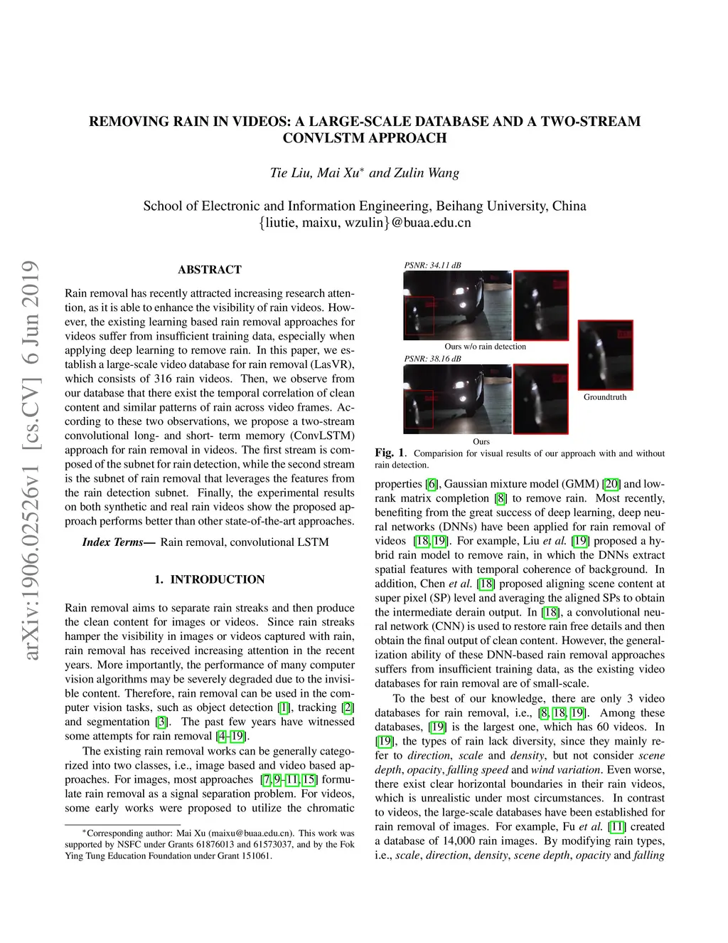 Rain removal has recently attracted increasing research attention, as it is able to enhance the visibility of rain videos. However, the existing learning based rain removal approaches for videos suffer from insufficient training data, especially when applying deep learning to remove rain. In this paper, we establish a large-scale video database for rain removal (LasVR), which consists of 316 rain videos. Then, we observe from our database that there exist the temporal correlation of clean content and similar patterns of rain across video frames. According to these two observations, we propose a two-stream convolutional long- and short- term memory (ConvLSTM) approach for rain removal in videos. The first stream is composed of the subnet for rain detection, while the second stream is the subnet of rain removal that leverages the features from the rain detection subnet. Finally, the experimental results on both synthetic and real rain videos show the proposed approach performs better than other state-of-the-art approaches.
