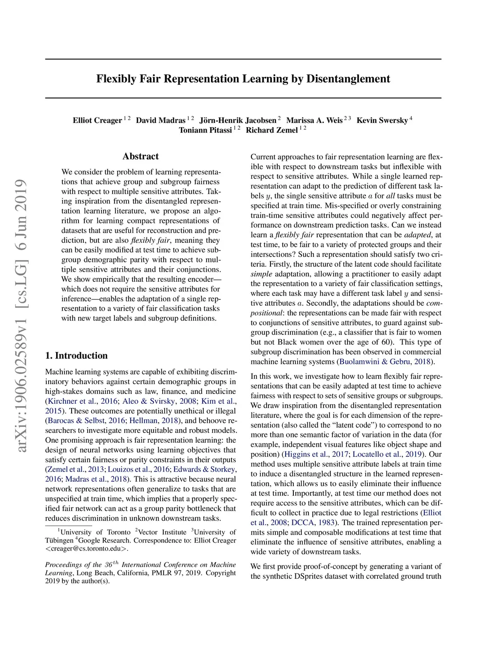 We consider the problem of learning representations that achieve group and subgroup fairness with respect to multiple sensitive attributes. Taking inspiration from the disentangled representation learning literature, we propose an algorithm for learning compact representations of datasets that are useful for reconstruction and prediction, but are also \emph{flexibly fair}, meaning they can be easily modified at test time to achieve subgroup demographic parity with respect to multiple sensitive attributes and their conjunctions. We show empirically that the resulting encoder---which does not require the sensitive attributes for inference---enables the adaptation of a single representation to a variety of fair classification tasks with new target labels and subgroup definitions.