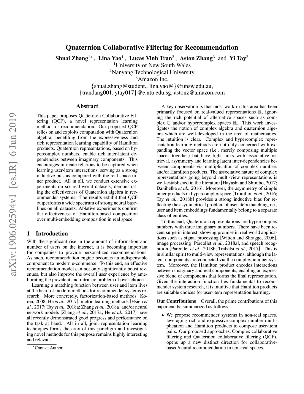 This paper proposes Quaternion Collaborative Filtering (QCF), a novel representation learning method for recommendation. Our proposed QCF relies on and exploits computation with Quaternion algebra, benefiting from the expressiveness and rich representation learning capability of Hamilton products. Quaternion representations, based on hypercomplex numbers, enable rich inter-latent dependencies between imaginary components. This encourages intricate relations to be captured when learning user-item interactions, serving as a strong inductive bias as compared with the real-space inner product. All in all, we conduct extensive experiments on six real-world datasets, demonstrating the effectiveness of Quaternion algebra in recommender systems. The results exhibit that QCF outperforms a wide spectrum of strong neural baselines on all datasets. Ablative experiments confirm the effectiveness of Hamilton-based composition over multi-embedding composition in real space.