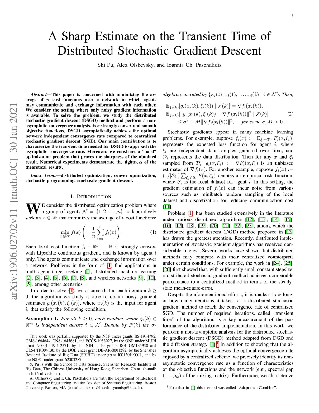 This paper is concerned with minimizing the average of cost functions over a network in which agents may communicate and exchange information with each other. We consider the setting where only noisy gradient information is available. To solve the problem, we study the distributed stochastic gradient descent (DSGD) method and perform a non-asymptotic convergence analysis. For strongly convex and smooth objective functions, DSGD asymptotically achieves the optimal network independent convergence rate compared to centralized stochastic gradient descent (SGD). Our main contribution is to characterize the transient time needed for DSGD to approach the asymptotic convergence rate, which we show behaves as , where denotes the spectral gap of the mixing matrix. Moreover, we construct a "hard" optimization problem for which we show the transient time needed for DSGD to approach the asymptotic convergence rate is lower bounded by , implying the sharpness of the obtained result. Numerical experiments demonstrate the tightness of the theoretical results.