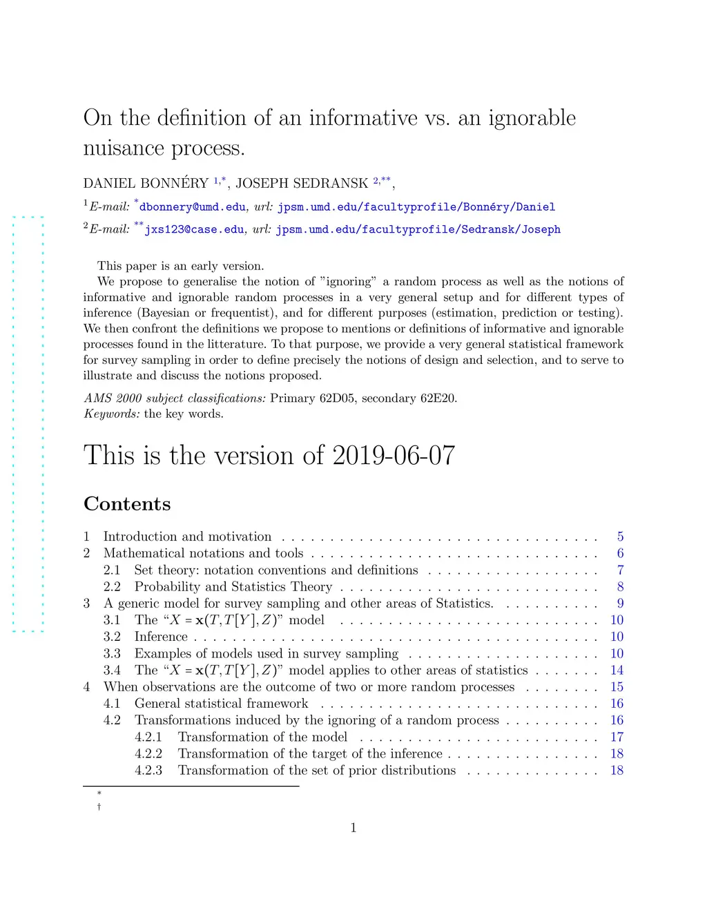 This paper is an early version. We propose to generalise the notion of "ignoring" a random process as well as the notions of informative and ignorable random processes in a very general setup and for different types of inference (Bayesian or frequentist), and for different purposes (estimation, prediction or testing). We then confront the definitions we propose to mentions or definitions of informative and ignorable processes found in the litterature. To that purpose, we provide a very general statistical framework for survey sampling in order to define precisely the notions of design and selection, and to serve to illustrate and discuss the notions proposed.