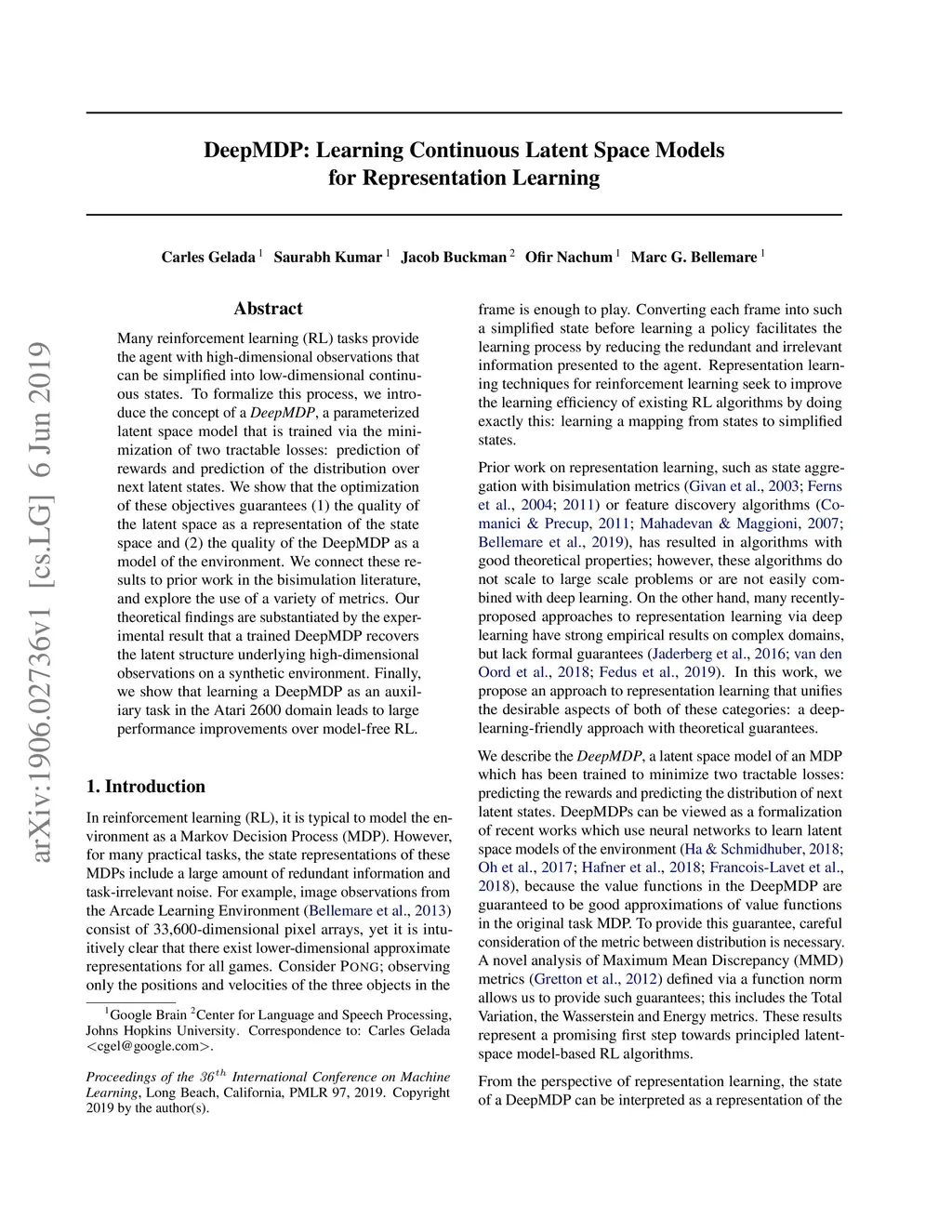 DeepMDP: Learning Continuous Latent Space Models for Representation