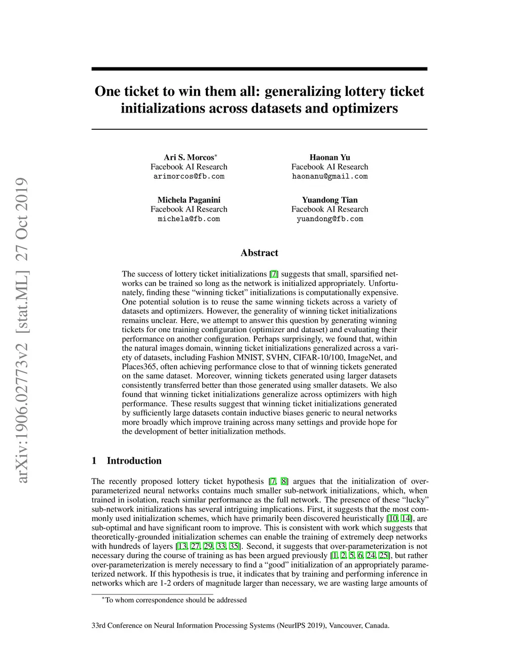 The success of lottery ticket initializations (Frankle and Carbin, 2019) suggests that small, sparsified networks can be trained so long as the network is initialized appropriately. Unfortunately, finding these "winning ticket" initializations is computationally expensive. One potential solution is to reuse the same winning tickets across a variety of datasets and optimizers. However, the generality of winning ticket initializations remains unclear. Here, we attempt to answer this question by generating winning tickets for one training configuration (optimizer and dataset) and evaluating their performance on another configuration. Perhaps surprisingly, we found that, within the natural images domain, winning ticket initializations generalized across a variety of datasets, including Fashion MNIST, SVHN, CIFAR-10/100, ImageNet, and Places365, often achieving performance close to that of winning tickets generated on the same dataset. Moreover, winning tickets generated using larger datasets consistently transferred better than those generated using smaller datasets. We also found that winning ticket initializations generalize across optimizers with high performance. These results suggest that winning ticket initializations generated by sufficiently large datasets contain inductive biases generic to neural networks more broadly which improve training across many settings and provide hope for the development of better initialization methods.