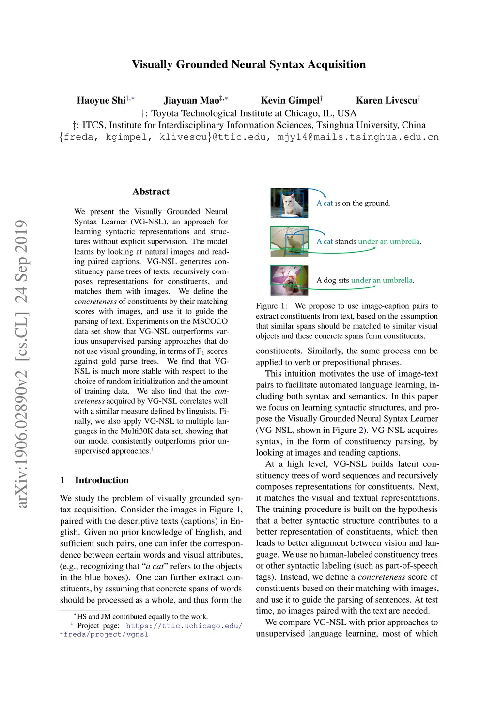 We present the Visually Grounded Neural Syntax Learner (VG-NSL), an approach for learning syntactic representations and structures without any explicit supervision. The model learns by looking at natural images and reading paired captions. VG-NSL generates constituency parse trees of texts, recursively composes representations for constituents, and matches them with images. We define concreteness of constituents by their matching scores with images, and use it to guide the parsing of text. Experiments on the MSCOCO data set show that VG-NSL outperforms various unsupervised parsing approaches that do not use visual grounding, in terms of F1 scores against gold parse trees. We find that VGNSL is much more stable with respect to the choice of random initialization and the amount of training data. We also find that the concreteness acquired by VG-NSL correlates well with a similar measure defined by linguists. Finally, we also apply VG-NSL to multiple languages in the Multi30K data set, showing that our model consistently outperforms prior unsupervised approaches.