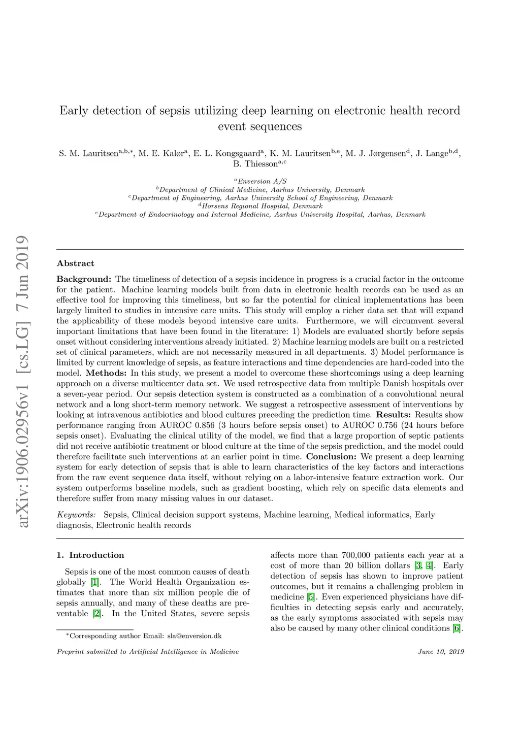 The timeliness of detection of a sepsis event in progress is a crucial factor in the outcome for the patient. Machine learning models built from data in electronic health records can be used as an effective tool for improving this timeliness, but so far the potential for clinical implementations has been largely limited to studies in intensive care units. This study will employ a richer data set that will expand the applicability of these models beyond intensive care units. Furthermore, we will circumvent several important limitations that have been found in the literature: 1) Models are evaluated shortly before sepsis onset without considering interventions already initiated. 2) Machine learning models are built on a restricted set of clinical parameters, which are not necessarily measured in all departments. 3) Model performance is limited by current knowledge of sepsis, as feature interactions and time dependencies are hardcoded into the model. In this study, we present a model to overcome these shortcomings using a deep learning approach on a diverse multicenter data set. We used retrospective data from multiple Danish hospitals over a seven-year period. Our sepsis detection system is constructed as a combination of a convolutional neural network and a long short-term memory network. We suggest a retrospective assessment of interventions by looking at intravenous antibiotics and blood cultures preceding the prediction time. Results show performance ranging from AUROC 0.856 (3 hours before sepsis onset) to AUROC 0.756 (24 hours before sepsis onset). We present a deep learning system for early detection of sepsis that is able to learn characteristics of the key factors and interactions from the raw event sequence data itself, without relying on a labor-intensive feature extraction work.
