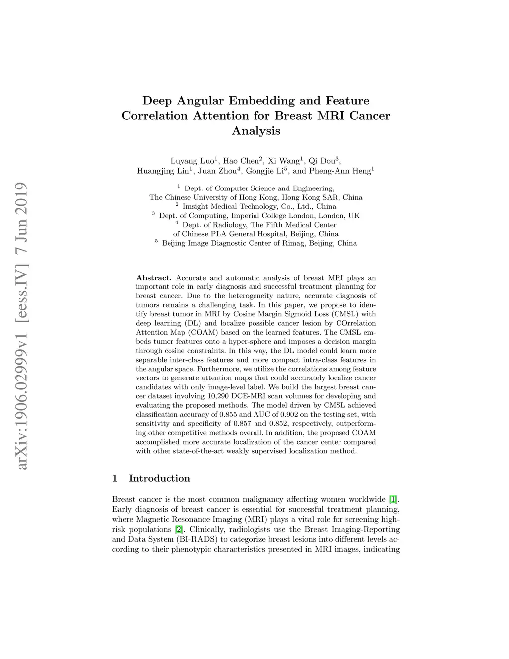 Deep Angular Embedding and Feature Correlation Attention for Breast MRI