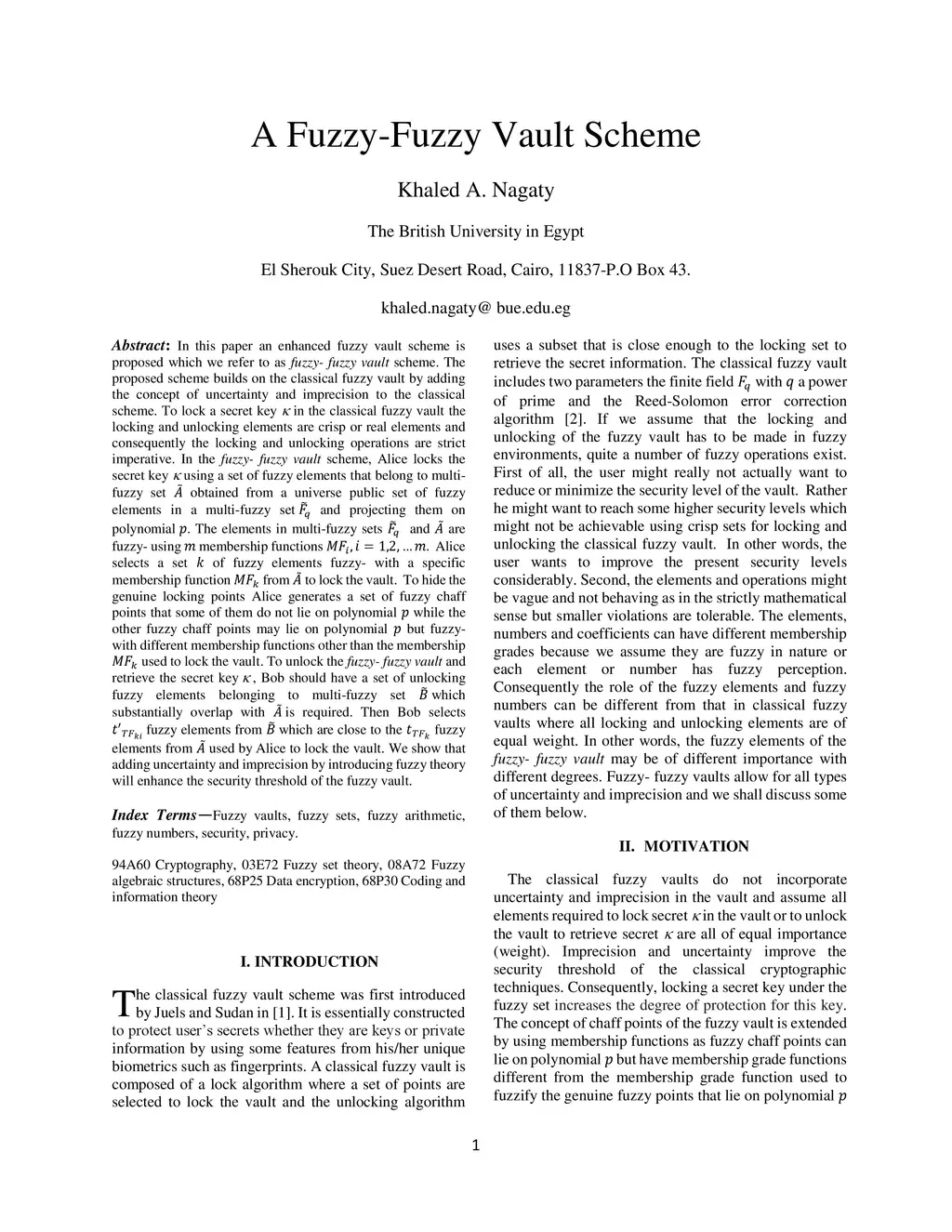 In this paper an enhanced fuzzy vault scheme is proposed which we refer to as fuzzy-fuzzy vault scheme. The proposed scheme builds on the classical fuzzy vault by adding the concept of uncertainty and imprecision to the classical scheme. To lock a secret key K in the classical fuzzy vault the locking and unlocking elements are crisp or real elements and consequently the locking and unlocking operations are strict imperative. In the fuzzy-fuzzy vault scheme, Alice locks the secret key K using a set of fuzzy elements that belong to multi-fuzzy set A~ obtained from a universe public set of fuzzy elements in a multi-fuzzy set F~_q and projecting them on polynomial p. The elements in multi-fuzzy sets F~_q and A~ are fuzzy using m membership functions MF_i, i=1,2,...,m. Alice selects a set k of fuzzy elements fuzzy with a specific membership function MF_K from A~ to lock the vault. To hide the genuine locking points Alice generates a set of fuzzy chaff points that some of them do not lie on polynomial p while the other fuzzy chaff points may lie on polynomial p but fuzzy with different membership functions other than the membership function MF_K used to lock the vault. To unlock the fuzzy-fuzzy vault and retrieve the secret key K , Bob should have a set of unlocking fuzzy elements belonging to multi-fuzzy set B~ which substantially overlap with A~ is required. Then Bob selects t'_(TF_ki) fuzzy elements from B~ which are close to the t_(TF_k) fuzzy elements from A~ used by Alice to lock the vault. We show that adding uncertainty and imprecision by introducing fuzzy theory will enhance the security threshold of the fuzzy vault.