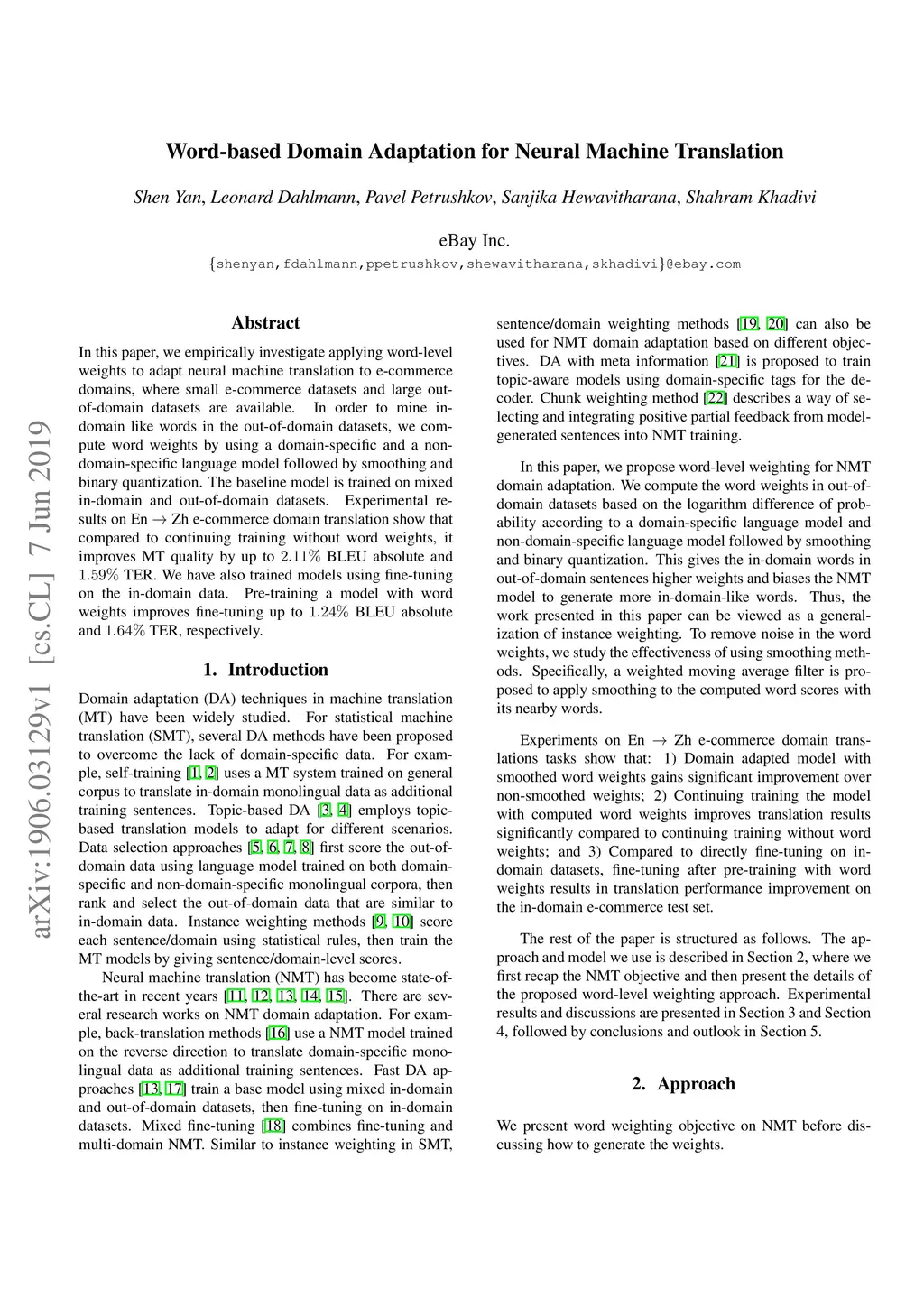 In this paper, we empirically investigate applying word-level weights to adapt neural machine translation to e-commerce domains, where small e-commerce datasets and large out-of-domain datasets are available. In order to mine in-domain like words in the out-of-domain datasets, we compute word weights by using a domain-specific and a non-domain-specific language model followed by smoothing and binary quantization. The baseline model is trained on mixed in-domain and out-of-domain datasets. Experimental results on English to Chinese e-commerce domain translation show that compared to continuing training without word weights, it improves MT quality by up to 2.11% BLEU absolute and 1.59% TER. We have also trained models using fine-tuning on the in-domain data. Pre-training a model with word weights improves fine-tuning up to 1.24% BLEU absolute and 1.64% TER, respectively.