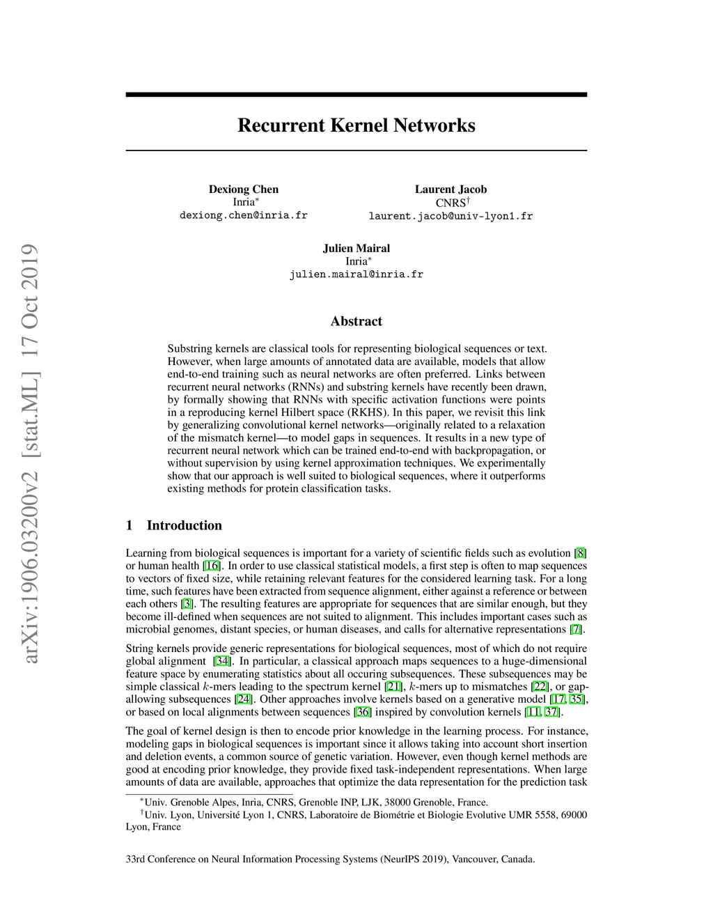Substring kernels are classical tools for representing biological sequences or text. However, when large amounts of annotated data are available, models that allow end-to-end training such as neural networks are often preferred. Links between recurrent neural networks (RNNs) and substring kernels have recently been drawn, by formally showing that RNNs with specific activation functions were points in a reproducing kernel Hilbert space (RKHS). In this paper, we revisit this link by generalizing convolutional kernel networks---originally related to a relaxation of the mismatch kernel---to model gaps in sequences. It results in a new type of recurrent neural network which can be trained end-to-end with backpropagation, or without supervision by using kernel approximation techniques. We experimentally show that our approach is well suited to biological sequences, where it outperforms existing methods for protein classification tasks.
