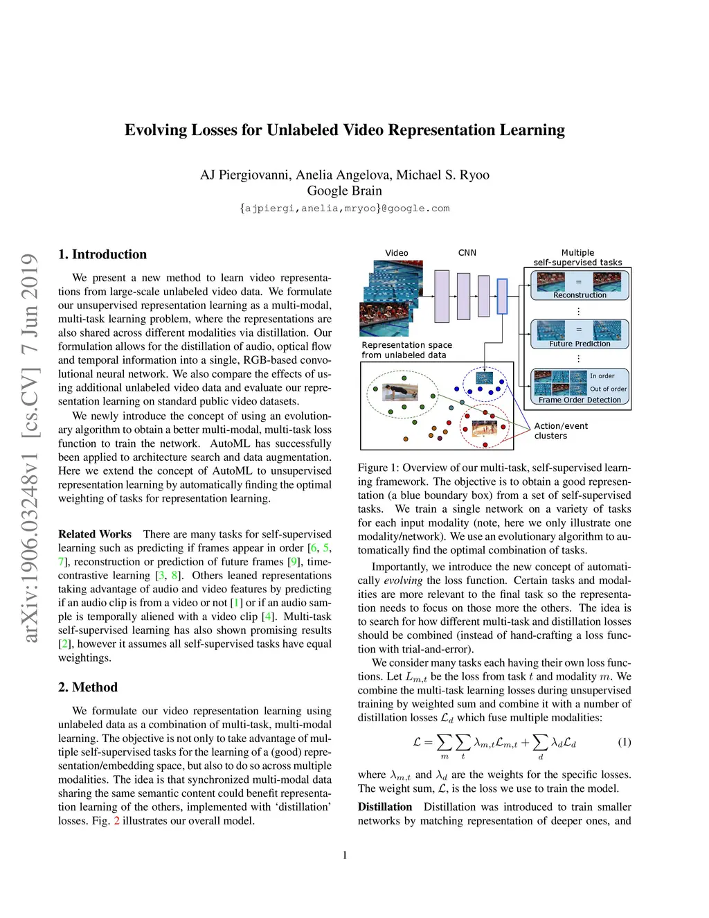 We present a new method to learn video representations from unlabeled data. Given large-scale unlabeled video data, the objective is to benefit from such data by learning a generic and transferable representation space that can be directly used for a new task such as zero/few-shot learning. We formulate our unsupervised representation learning as a multi-modal, multi-task learning problem, where the representations are also shared across different modalities via distillation. Further, we also introduce the concept of finding a better loss function to train such multi-task multi-modal representation space using an evolutionary algorithm; our method automatically searches over different combinations of loss functions capturing multiple (self-supervised) tasks and modalities. Our formulation allows for the distillation of audio, optical flow and temporal information into a single, RGB-based convolutional neural network. We also compare the effects of using additional unlabeled video data and evaluate our representation learning on standard public video datasets.