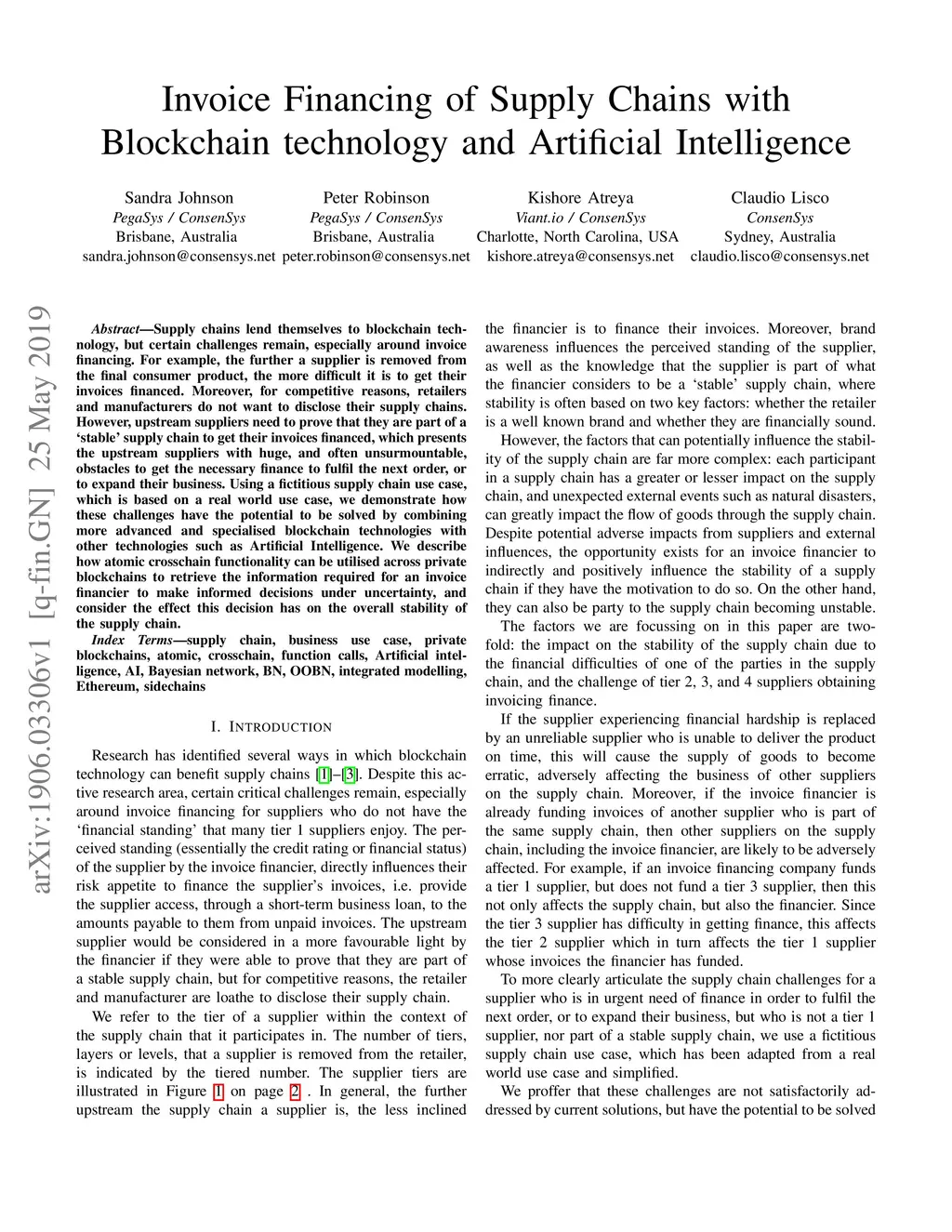 Supply chains lend themselves to blockchain technology, but certain challenges remain, especially around invoice financing. For example, the further a supplier is removed from the final consumer product, the more difficult it is to get their invoices financed. Moreover, for competitive reasons, retailers and manufacturers do not want to disclose their supply chains. However, upstream suppliers need to prove that they are part of a `stable' supply chain to get their invoices financed, which presents the upstream suppliers with huge, and often unsurmountable, obstacles to get the necessary finance to fulfil the next order, or to expand their business. Using a fictitious supply chain use case, which is based on a real world use case, we demonstrate how these challenges have the potential to be solved by combining more advanced and specialised blockchain technologies with other technologies such as Artificial Intelligence. We describe how atomic crosschain functionality can be utilised across private blockchains to retrieve the information required for an invoice financier to make informed decisions under uncertainty, and consider the effect this decision has on the overall stability of the supply chain.