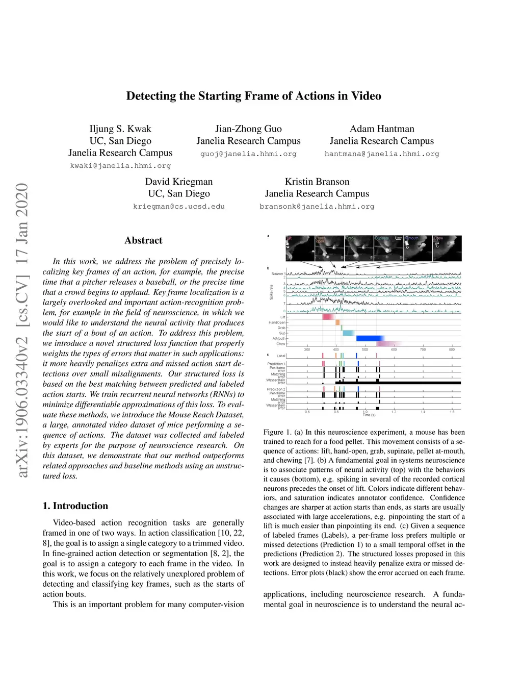 In this work, we address the problem of precisely localizing key frames of an action, for example, the precise time that a pitcher releases a baseball, or the precise time that a crowd begins to applaud. Key frame localization is a largely overlooked and important action-recognition problem, for example in the field of neuroscience, in which we would like to understand the neural activity that produces the start of a bout of an action. To address this problem, we introduce a novel structured loss function that properly weights the types of errors that matter in such applications: it more heavily penalizes extra and missed action start detections over small misalignments. Our structured loss is based on the best matching between predicted and labeled action starts. We train recurrent neural networks (RNNs) to minimize differentiable approximations of this loss. To evaluate these methods, we introduce the Mouse Reach Dataset, a large, annotated video dataset of mice performing a sequence of actions. The dataset was collected and labeled by experts for the purpose of neuroscience research. On this dataset, we demonstrate that our method outperforms related approaches and baseline methods using an unstructured loss.