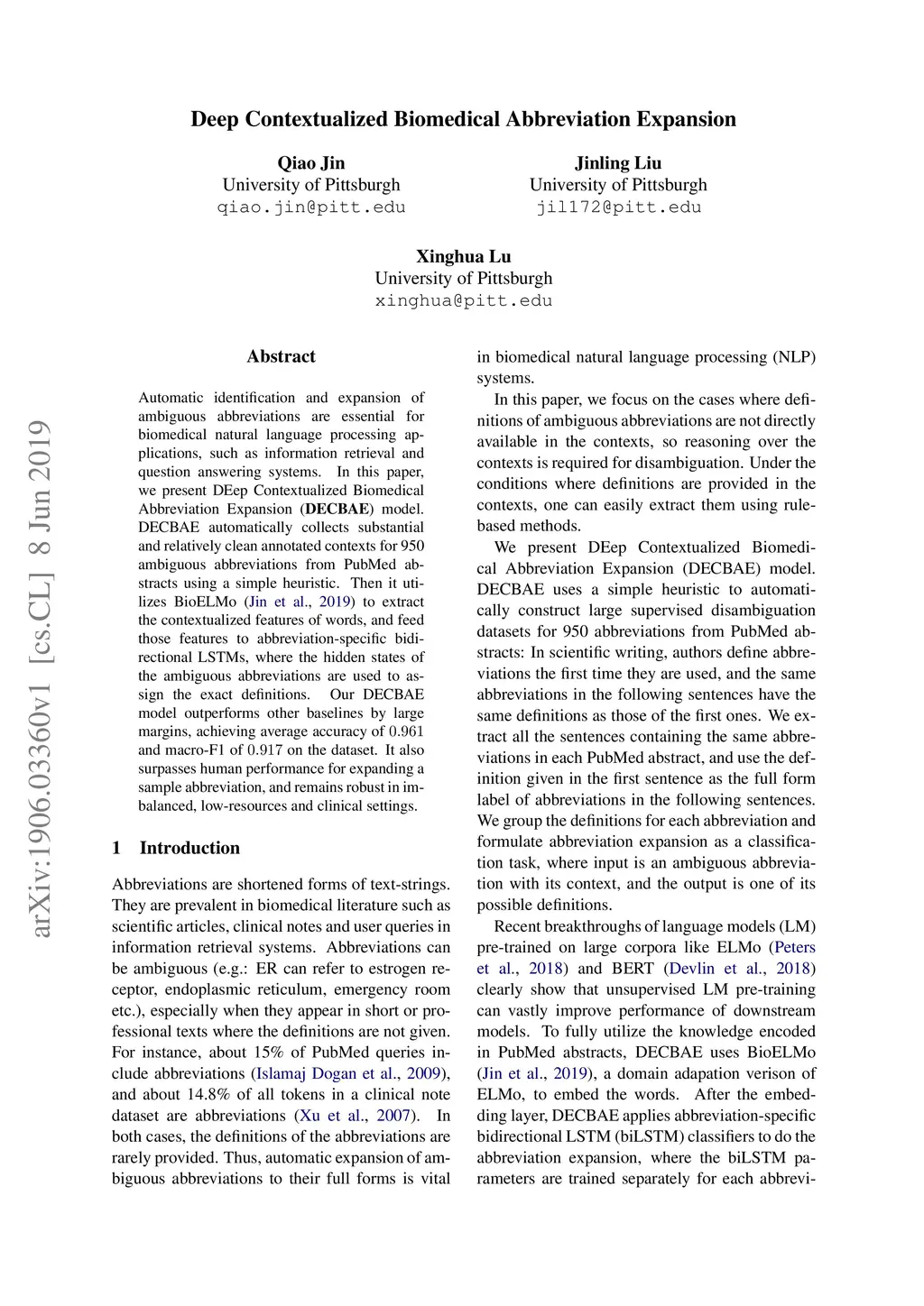 Automatic identification and expansion of ambiguous abbreviations are essential for biomedical natural language processing applications, such as information retrieval and question answering systems. In this paper, we present DEep Contextualized Biomedical. Abbreviation Expansion (DECBAE) model. DECBAE automatically collects substantial and relatively clean annotated contexts for 950 ambiguous abbreviations from PubMed abstracts using a simple heuristic. Then it utilizes BioELMo to extract the contextualized features of words, and feed those features to abbreviation-specific bidirectional LSTMs, where the hidden states of the ambiguous abbreviations are used to assign the exact definitions. Our DECBAE model outperforms other baselines by large margins, achieving average accuracy of 0.961 and macro-F1 of 0.917 on the dataset. It also surpasses human performance for expanding a sample abbreviation, and remains robust in imbalanced, low-resources and clinical settings.