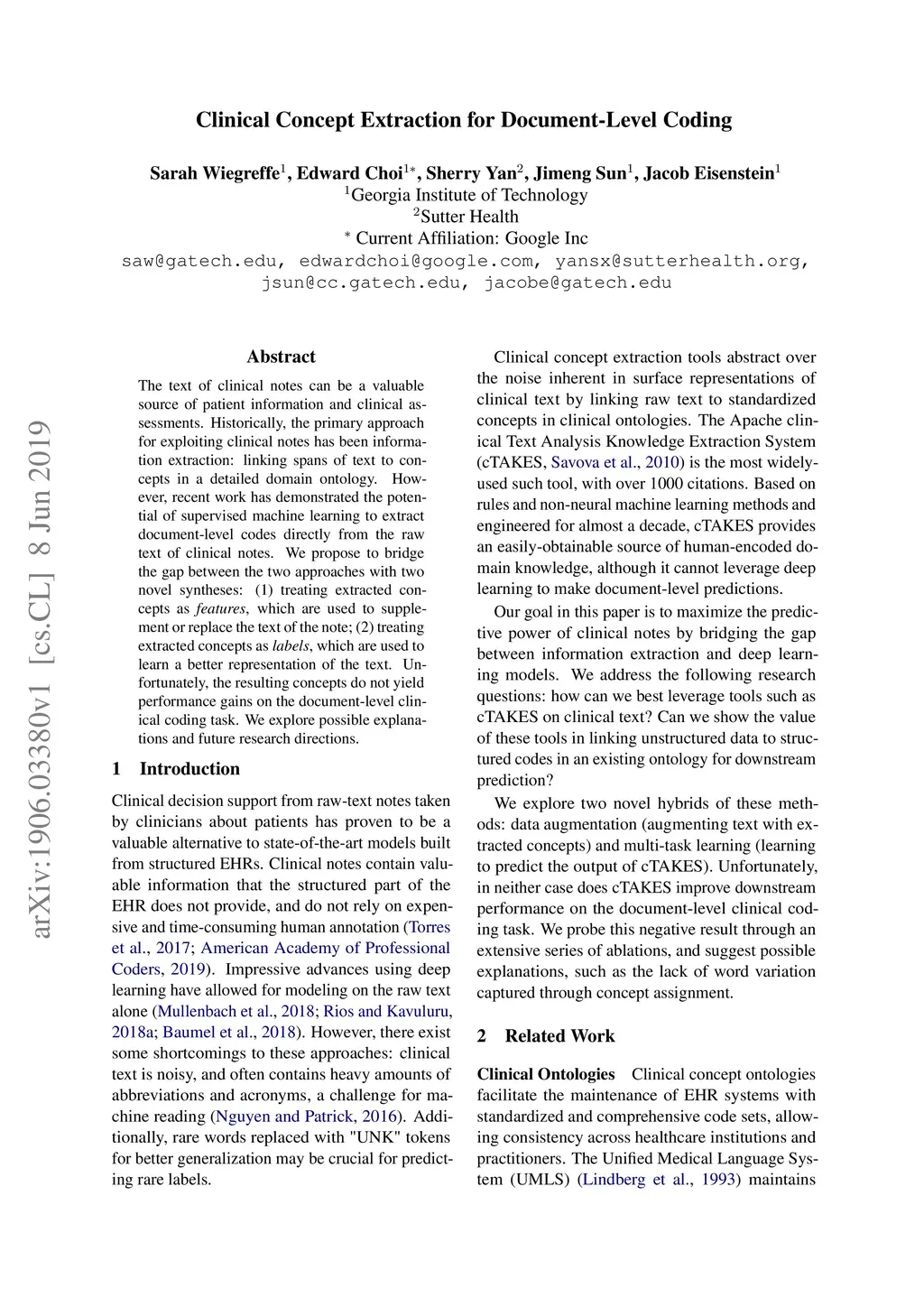 The text of clinical notes can be a valuable source of patient information and clinical assessments. Historically, the primary approach for exploiting clinical notes has been information extraction: linking spans of text to concepts in a detailed domain ontology. However, recent work has demonstrated the potential of supervised machine learning to extract document-level codes directly from the raw text of clinical notes. We propose to bridge the gap between the two approaches with two novel syntheses: (1) treating extracted concepts as features, which are used to supplement or replace the text of the note; (2) treating extracted concepts as labels, which are used to learn a better representation of the text. Unfortunately, the resulting concepts do not yield performance gains on the document-level clinical coding task. We explore possible explanations and future research directions.