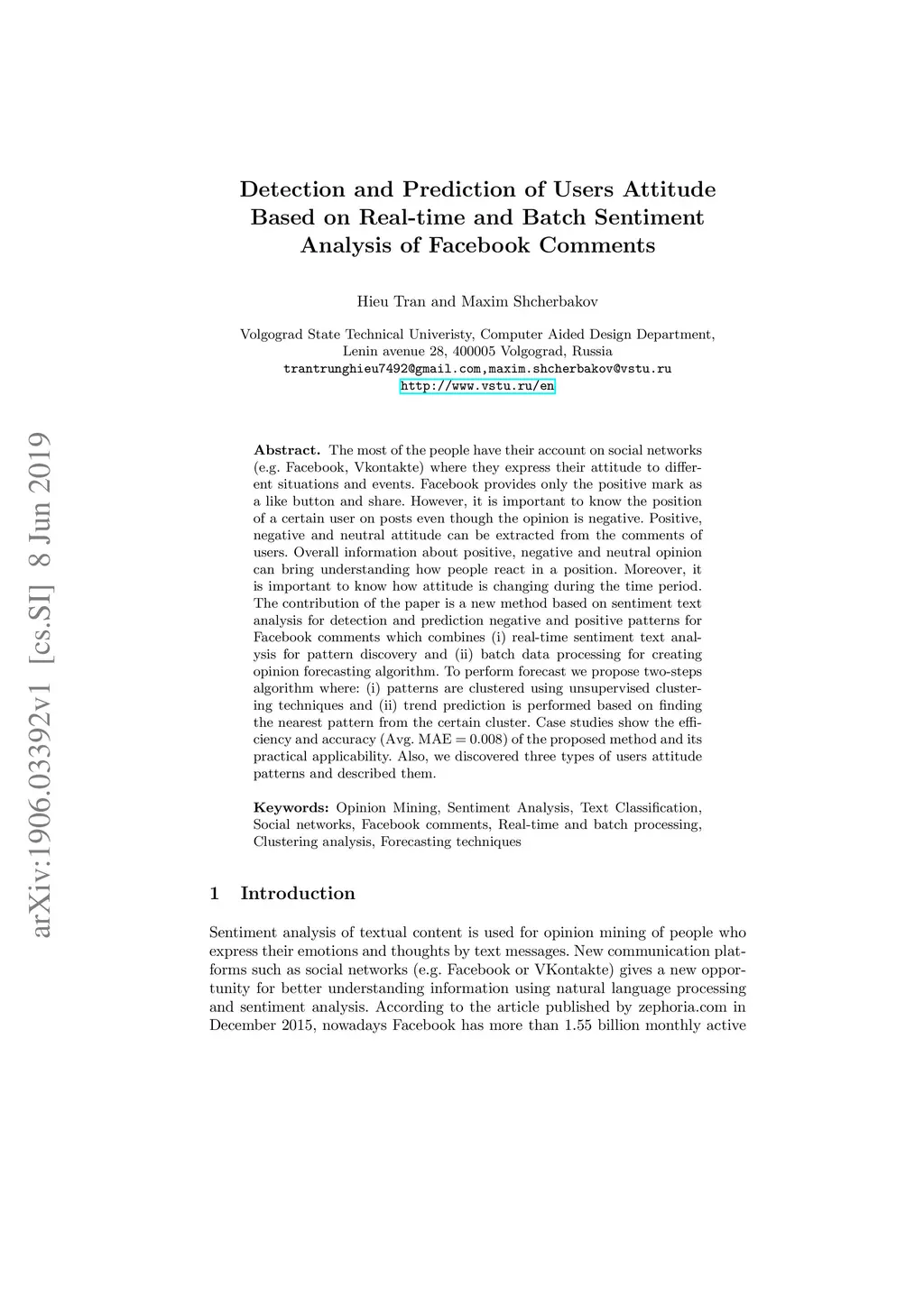 The most of the people have their account on social networks (e.g. Facebook, Vkontakte) where they express their attitude to different situations and events. Facebook provides only the positive mark as a like button and share. However, it is important to know the position of a certain user on posts even though the opinion is negative. Positive, negative and neutral attitude can be extracted from the comments of users. Overall information about positive, negative and neutral opinion can bring the understanding of how people react in a position. Moreover, it is important to know how attitude is changing during the time period. The contribution of the paper is a new method based on sentiment text analysis for detection and prediction negative and positive patterns for Facebook comments which combines (i) real-time sentiment text analysis for pattern discovery and (ii) batch data processing for creating opinion forecasting algorithm. To perform forecast we propose two-steps algorithm where: (i) patterns are clustered using unsupervised clustering techniques and (ii) trend prediction is performed based on finding the nearest pattern from the certain cluster. Case studies show the efficiency and accuracy (Avg. MAE = 0.008) of the proposed method and its practical applicability. Also, we discovered three types of users attitude patterns and described them.