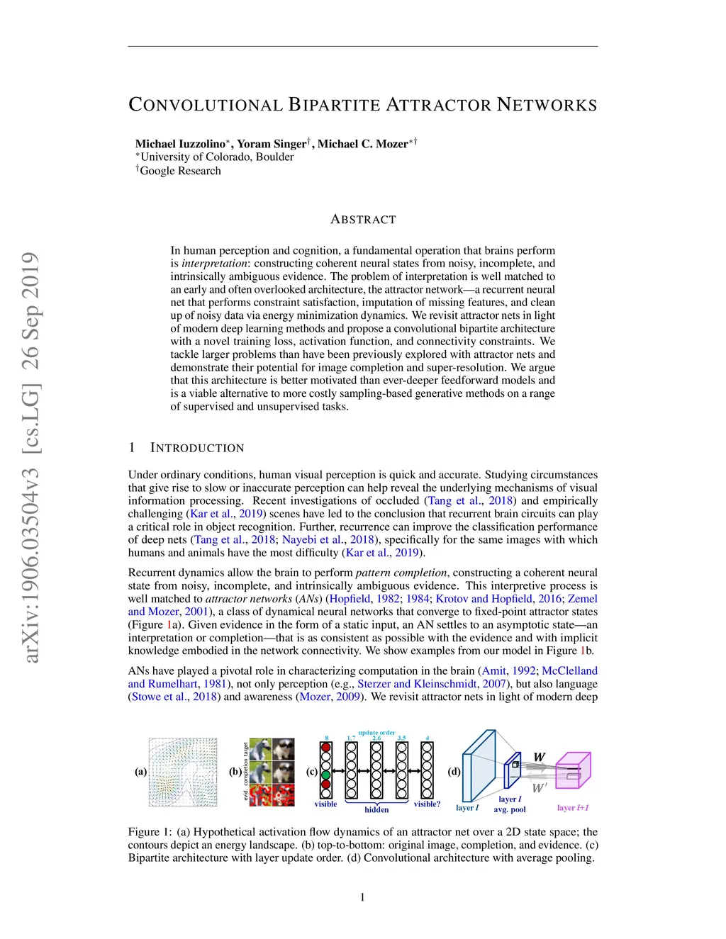 In human perception and cognition, a fundamental operation that brains perform is interpretation: constructing coherent neural states from noisy, incomplete, and intrinsically ambiguous evidence. The problem of interpretation is well matched to an early and often overlooked architecture, the attractor network---a recurrent neural net that performs constraint satisfaction, imputation of missing features, and clean up of noisy data via energy minimization dynamics. We revisit attractor nets in light of modern deep learning methods and propose a convolutional bipartite architecture with a novel training loss, activation function, and connectivity constraints. We tackle larger problems than have been previously explored with attractor nets and demonstrate their potential for image completion and super-resolution. We argue that this architecture is better motivated than ever-deeper feedforward models and is a viable alternative to more costly sampling-based generative methods on a range of supervised and unsupervised tasks.
