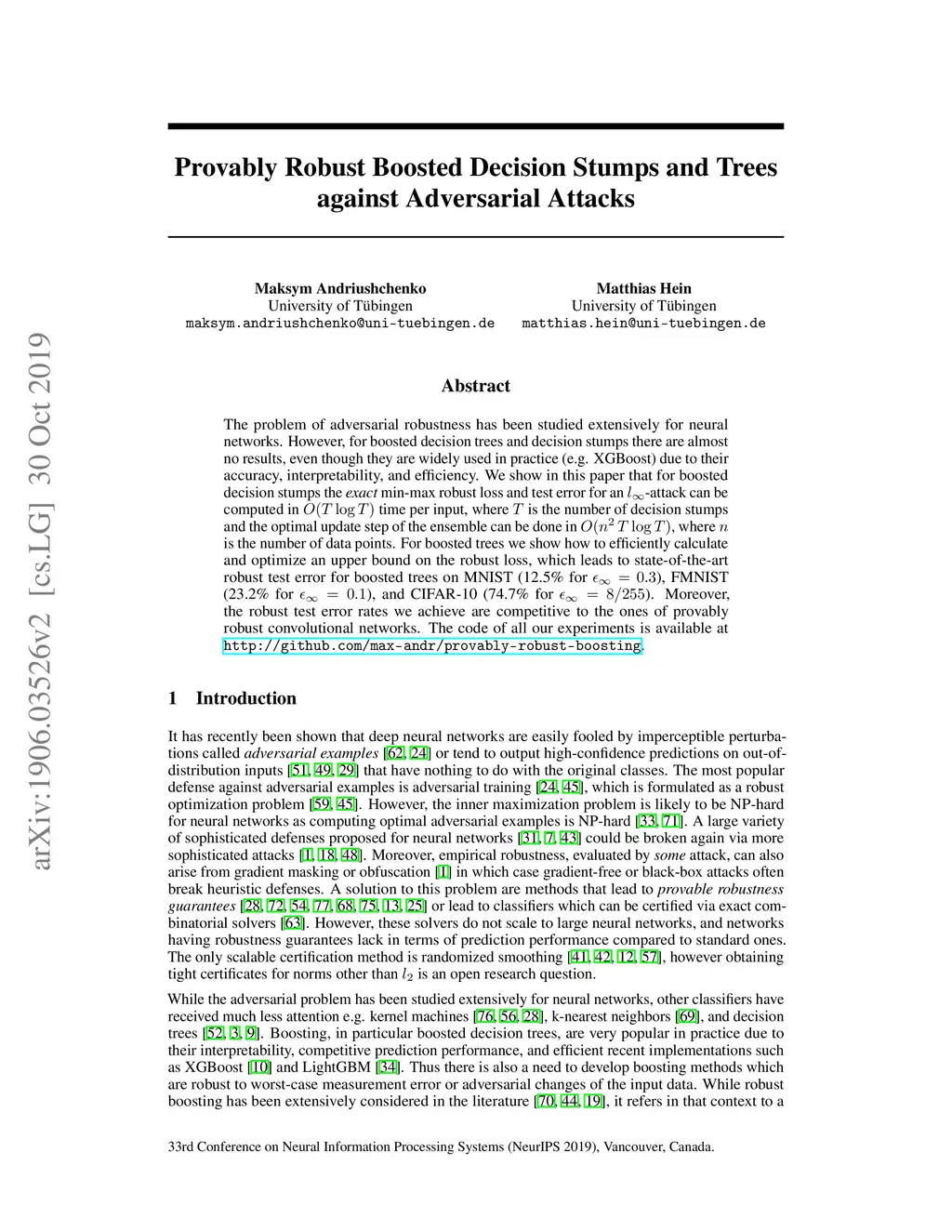 The problem of adversarial robustness has been studied extensively for neural networks. However, for boosted decision trees and decision stumps there are almost no results, even though they are widely used in practice (e.g. XGBoost) due to their accuracy, interpretability, and efficiency. We show in this paper that for boosted decision stumps the \textit{exact} min-max robust loss and test error for an -attack can be computed in time per input, where is the number of decision stumps and the optimal update step of the ensemble can be done in , where is the number of data points. For boosted trees we show how to efficiently calculate and optimize an upper bound on the robust loss, which leads to state-of-the-art robust test error for boosted trees on MNIST (12.5% for ), FMNIST (23.2% for ), and CIFAR-10 (74.7% for ). Moreover, the robust test error rates we achieve are competitive to the ones of provably robust convolutional networks. The code of all our experiments is available at http://github.com/max-andr/provably-robust-boosting