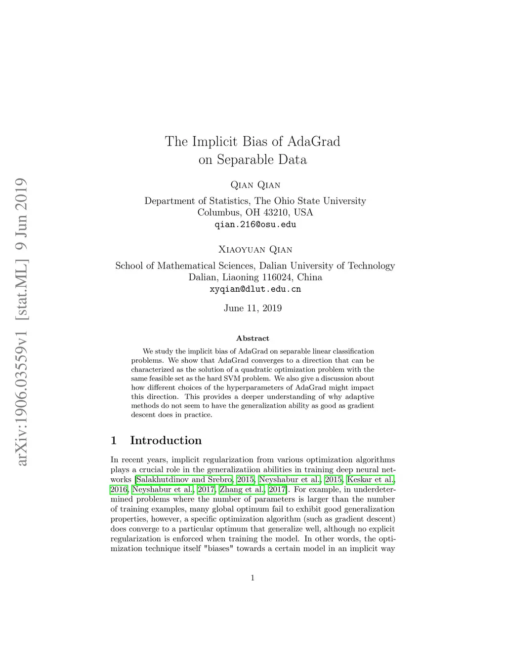 We study the implicit bias of AdaGrad on separable linear classification problems. We show that AdaGrad converges to a direction that can be characterized as the solution of a quadratic optimization problem with the same feasible set as the hard SVM problem. We also give a discussion about how different choices of the hyperparameters of AdaGrad might impact this direction. This provides a deeper understanding of why adaptive methods do not seem to have the generalization ability as good as gradient descent does in practice.