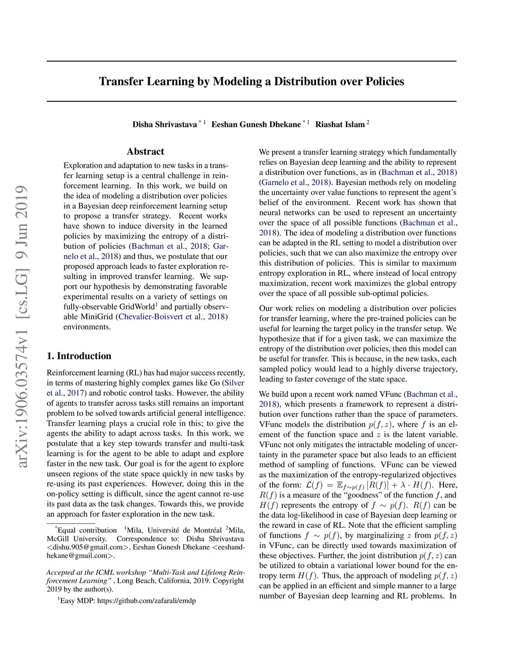 Transfer Learning by Modeling a Distribution over Policies