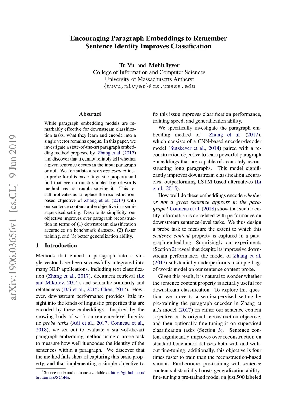 While paragraph embedding models are remarkably effective for downstream classification tasks, what they learn and encode into a single vector remains opaque. In this paper, we investigate a state-of-the-art paragraph embedding method proposed by Zhang et al. (2017) and discover that it cannot reliably tell whether a given sentence occurs in the input paragraph or not. We formulate a sentence content task to probe for this basic linguistic property and find that even a much simpler bag-of-words method has no trouble solving it. This result motivates us to replace the reconstruction-based objective of Zhang et al. (2017) with our sentence content probe objective in a semi-supervised setting. Despite its simplicity, our objective improves over paragraph reconstruction in terms of (1) downstream classification accuracies on benchmark datasets, (2) faster training, and (3) better generalization ability.