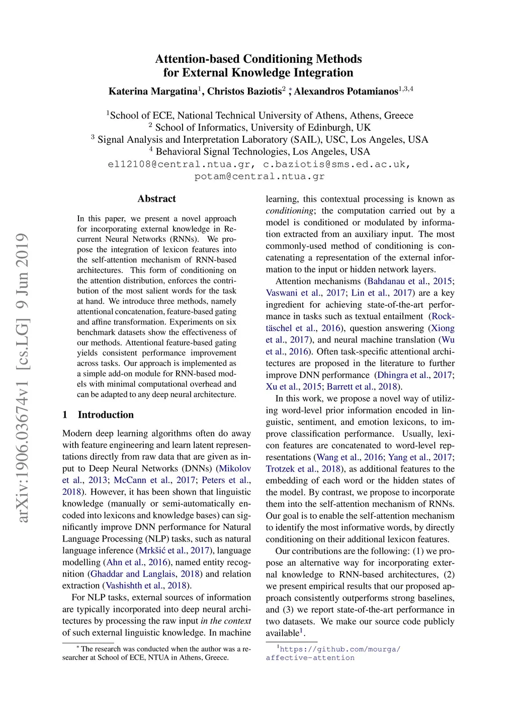Attention-based Conditioning Methods for External Knowledge Integration