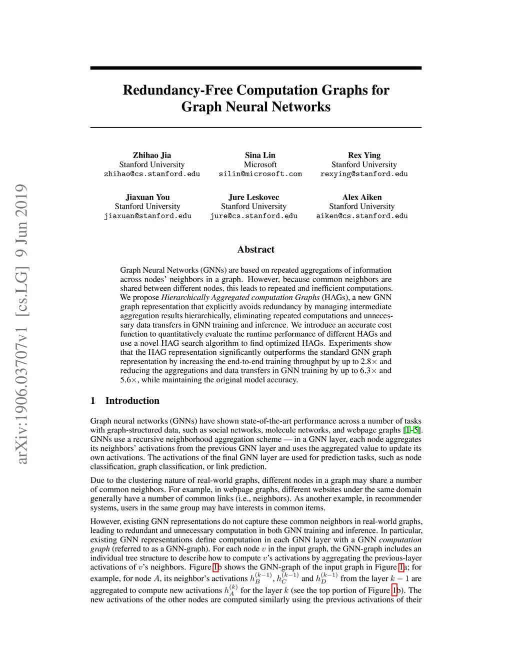 Graph Neural Networks (GNNs) are based on repeated aggregations of information across nodes' neighbors in a graph. However, because common neighbors are shared between different nodes, this leads to repeated and inefficient computations. We propose Hierarchically Aggregated computation Graphs (HAGs), a new GNN graph representation that explicitly avoids redundancy by managing intermediate aggregation results hierarchically, eliminating repeated computations and unnecessary data transfers in GNN training and inference. We introduce an accurate cost function to quantitatively evaluate the runtime performance of different HAGs and use a novel HAG search algorithm to find optimized HAGs. Experiments show that the HAG representation significantly outperforms the standard GNN graph representation by increasing the end-to-end training throughput by up to 2.8x and reducing the aggregations and data transfers in GNN training by up to 6.3x and 5.6x, while maintaining the original model accuracy.