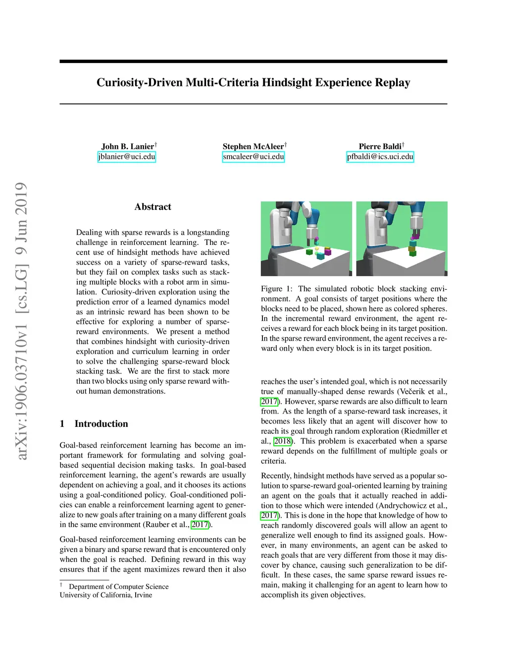 Dealing with sparse rewards is a longstanding challenge in reinforcement learning. The recent use of hindsight methods have achieved success on a variety of sparse-reward tasks, but they fail on complex tasks such as stacking multiple blocks with a robot arm in simulation. Curiosity-driven exploration using the prediction error of a learned dynamics model as an intrinsic reward has been shown to be effective for exploring a number of sparse-reward environments. We present a method that combines hindsight with curiosity-driven exploration and curriculum learning in order to solve the challenging sparse-reward block stacking task. We are the first to stack more than two blocks using only sparse reward without human demonstrations.