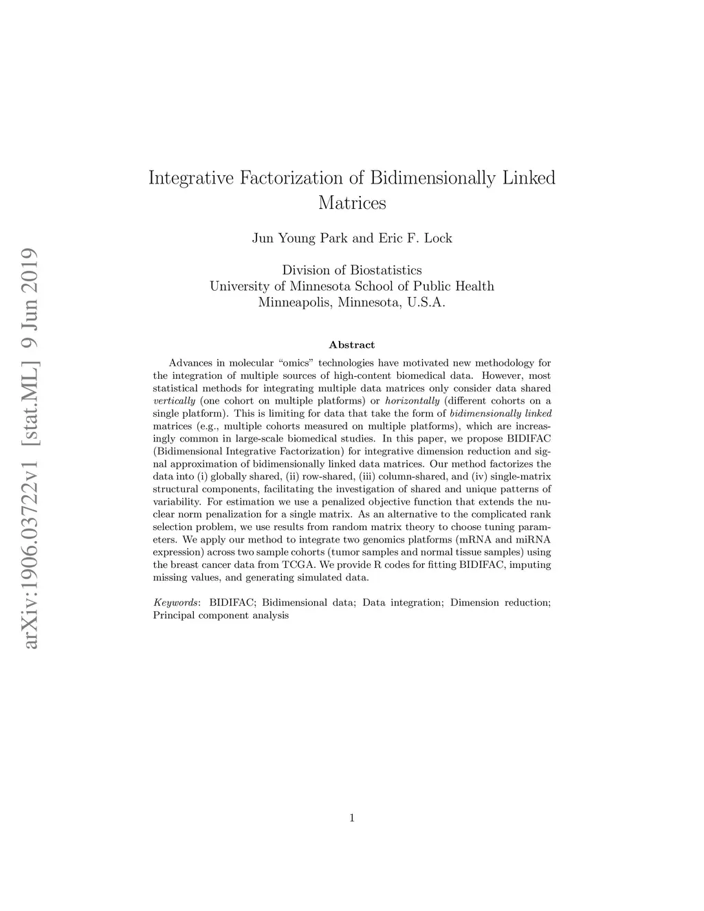 Advances in molecular "omics'" technologies have motivated new methodology for the integration of multiple sources of high-content biomedical data. However, most statistical methods for integrating multiple data matrices only consider data shared vertically (one cohort on multiple platforms) or horizontally (different cohorts on a single platform). This is limiting for data that take the form of bidimensionally linked matrices (e.g., multiple cohorts measured on multiple platforms), which are increasingly common in large-scale biomedical studies. In this paper, we propose BIDIFAC (Bidimensional Integrative Factorization) for integrative dimension reduction and signal approximation of bidimensionally linked data matrices. Our method factorizes the data into (i) globally shared, (ii) row-shared, (iii) column-shared, and (iv) single-matrix structural components, facilitating the investigation of shared and unique patterns of variability. For estimation we use a penalized objective function that extends the nuclear norm penalization for a single matrix. As an alternative to the complicated rank selection problem, we use results from random matrix theory to choose tuning parameters. We apply our method to integrate two genomics platforms (mRNA and miRNA expression) across two sample cohorts (tumor samples and normal tissue samples) using the breast cancer data from TCGA. We provide R code for fitting BIDIFAC, imputing missing values, and generating simulated data.