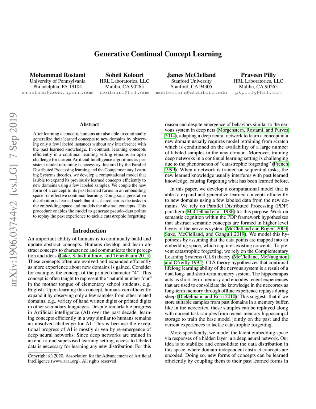 After learning a concept, humans are also able to continually generalize their learned concepts to new domains by observing only a few labeled instances without any interference with the past learned knowledge. In contrast, learning concepts efficiently in a continual learning setting remains an open challenge for current Artificial Intelligence algorithms as persistent model retraining is necessary. Inspired by the Parallel Distributed Processing learning and the Complementary Learning Systems theories, we develop a computational model that is able to expand its previously learned concepts efficiently to new domains using a few labeled samples. We couple the new form of a concept to its past learned forms in an embedding space for effective continual learning. Doing so, a generative distribution is learned such that it is shared across the tasks in the embedding space and models the abstract concepts. This procedure enables the model to generate pseudo-data points to replay the past experience to tackle catastrophic forgetting.