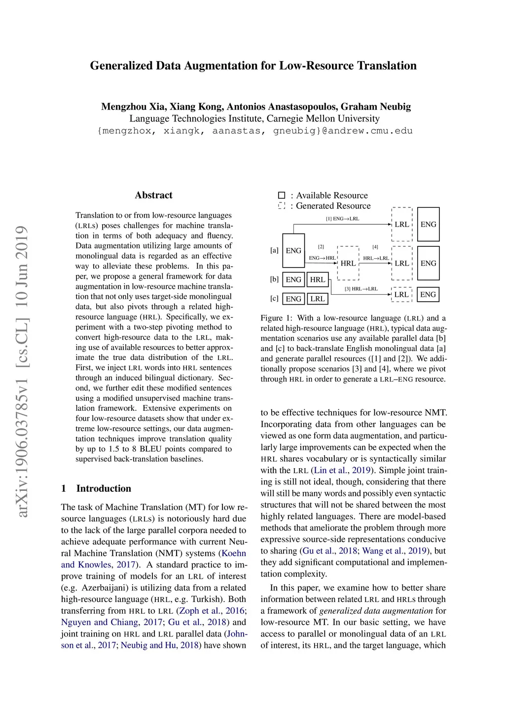 Translation to or from low-resource languages LRLs poses challenges for machine translation in terms of both adequacy and fluency. Data augmentation utilizing large amounts of monolingual data is regarded as an effective way to alleviate these problems. In this paper, we propose a general framework for data augmentation in low-resource machine translation that not only uses target-side monolingual data, but also pivots through a related high-resource language HRL. Specifically, we experiment with a two-step pivoting method to convert high-resource data to the LRL, making use of available resources to better approximate the true data distribution of the LRL. First, we inject LRL words into HRL sentences through an induced bilingual dictionary. Second, we further edit these modified sentences using a modified unsupervised machine translation framework. Extensive experiments on four low-resource datasets show that under extreme low-resource settings, our data augmentation techniques improve translation quality by up to~1.5 to~8 BLEU points compared to supervised back-translation baselines