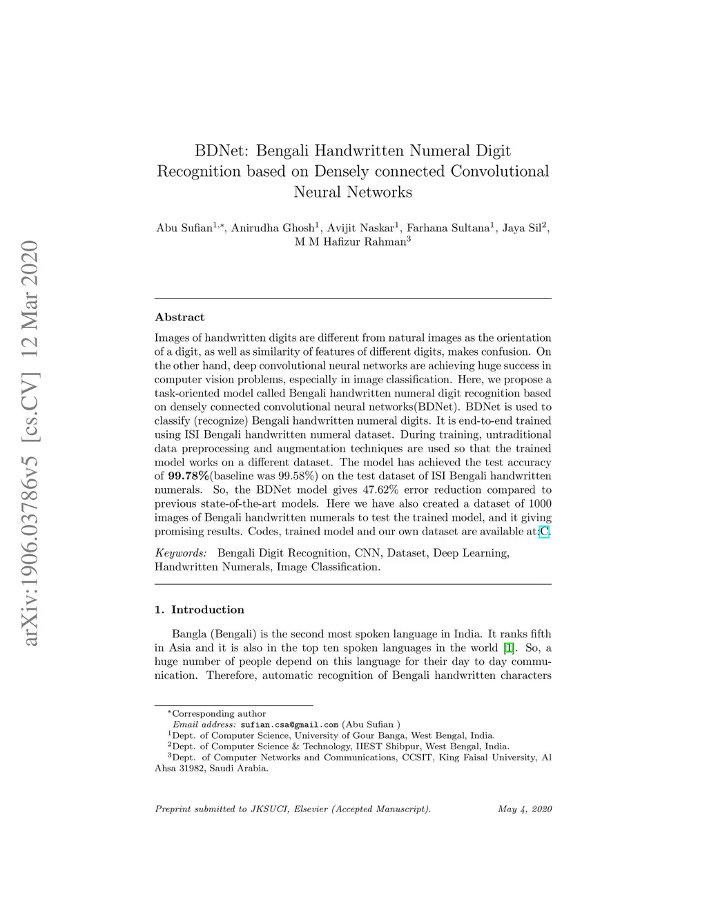 BDNet: Bengali Handwritten Numeral Digit Recognition based on Densely