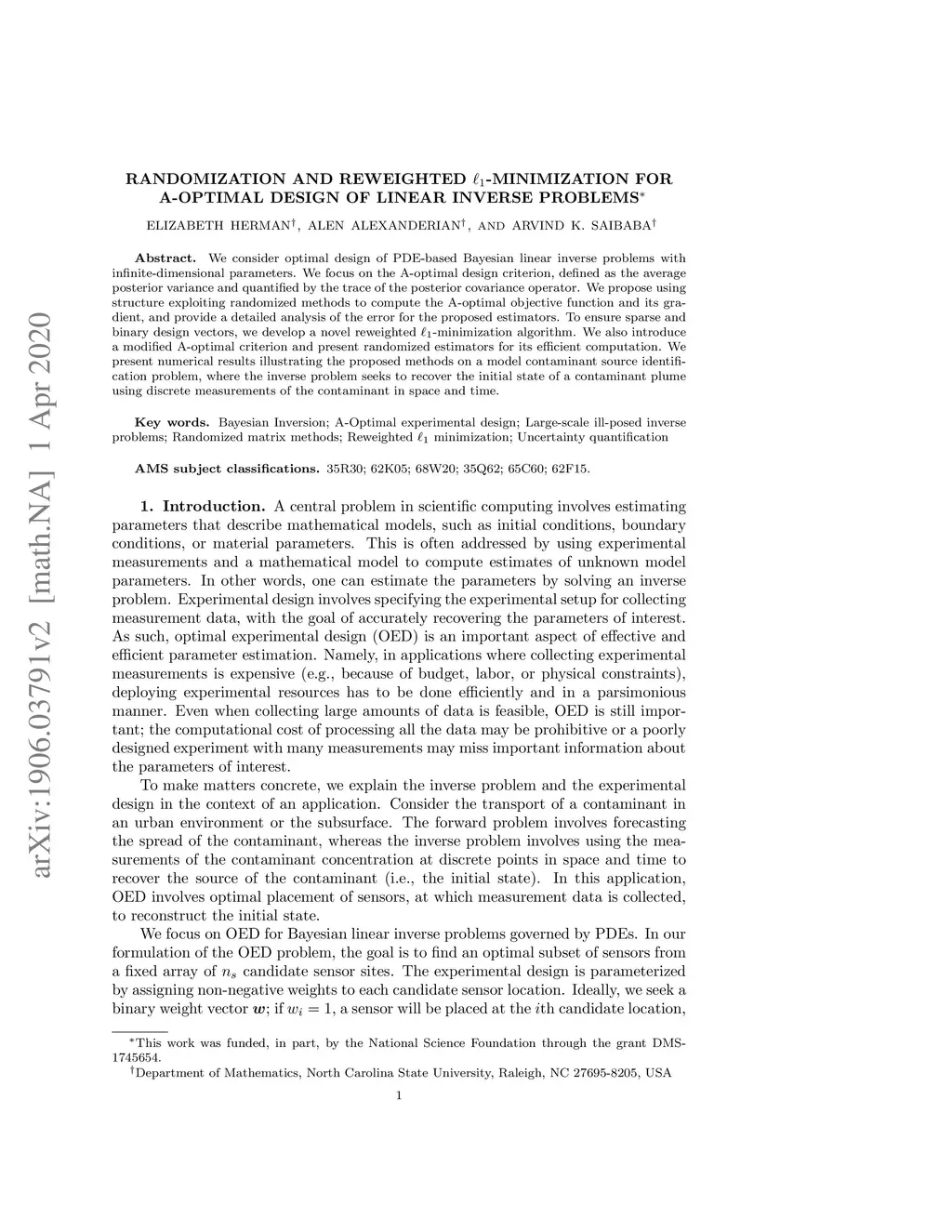 We consider optimal design of PDE-based Bayesian linear inverse problems with infinite-dimensional parameters. We focus on the A-optimal design criterion, defined as the average posterior variance and quantified by the trace of the posterior covariance operator. We propose using structure exploiting randomized methods to compute the A-optimal objective function and its gradient, and provide a detailed analysis of the error for the proposed estimators. To ensure sparse and binary design vectors, we develop a novel reweighted -minimization algorithm. We also introduce a modified A-optimal criterion and present randomized estimators for its efficient computation. We present numerical results illustrating the proposed methods on a model contaminant source identification problem, where the inverse problem seeks to recover the initial state of a contaminant plume, using discrete measurements of the contaminant in space and time.