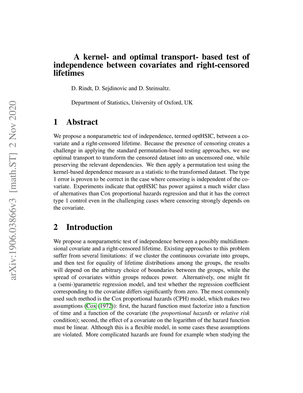We propose a nonparametric test of independence, termed optHSIC, between a covariate and a right-censored lifetime. Because the presence of censoring creates a challenge in applying the standard permutation-based testing approaches, we use optimal transport to transform the censored dataset into an uncensored one, while preserving the relevant dependencies. We then apply a permutation test using the kernel-based dependence measure as a statistic to the transformed dataset. The type 1 error is proven to be correct in the case where censoring is independent of the covariate. Experiments indicate that optHSIC has power against a much wider class of alternatives than Cox proportional hazards regression and that it has the correct type 1 control even in the challenging cases where censoring strongly depends on the covariate.