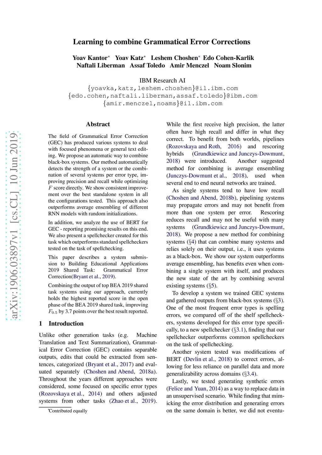 The field of Grammatical Error Correction (GEC) has produced various systems to deal with focused phenomena or general text editing. We propose an automatic way to combine black-box systems. Our method automatically detects the strength of a system or the combination of several systems per error type, improving precision and recall while optimizing score directly. We show consistent improvement over the best standalone system in all the configurations tested. This approach also outperforms average ensembling of different RNN models with random initializations. In addition, we analyze the use of BERT for GEC - reporting promising results on this end. We also present a spellchecker created for this task which outperforms standard spellcheckers tested on the task of spellchecking. This paper describes a system submission to Building Educational Applications 2019 Shared Task: Grammatical Error Correction. Combining the output of top BEA 2019 shared task systems using our approach, currently holds the highest reported score in the open phase of the BEA 2019 shared task, improving F0.5 by 3.7 points over the best result reported.