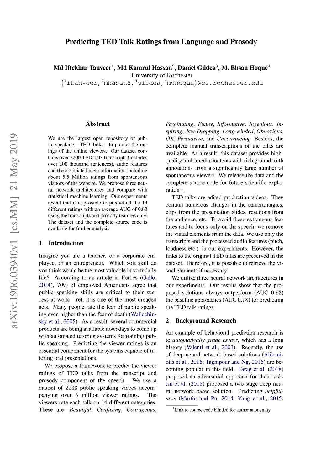 Predicting TED Talk Ratings from Language and Prosody