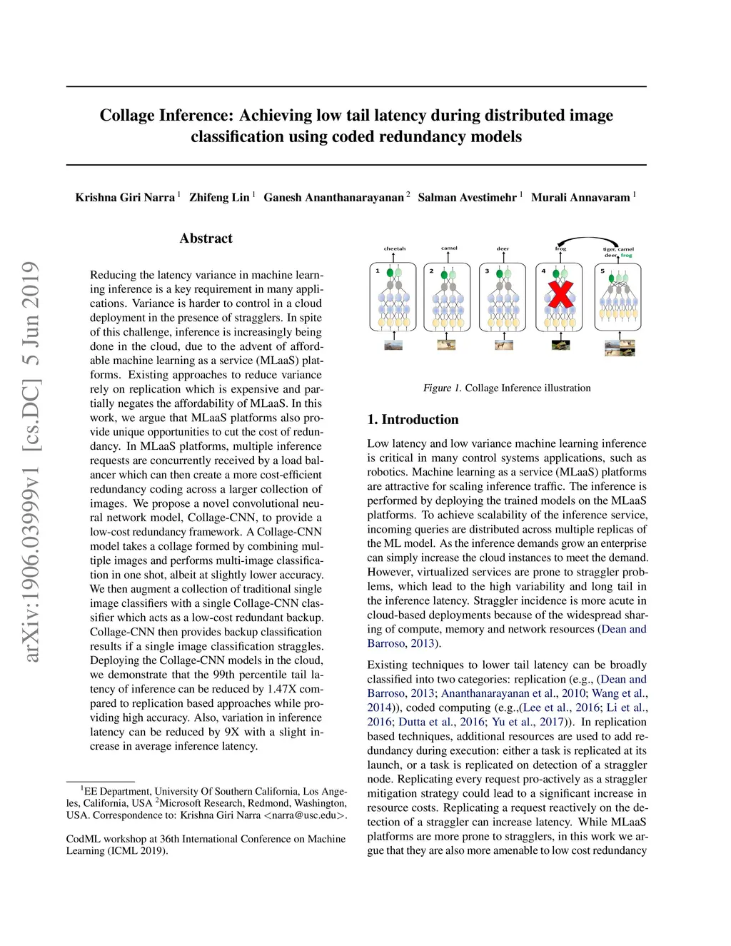 Reducing the latency variance in machine learning inference is a key requirement in many applications. Variance is harder to control in a cloud deployment in the presence of stragglers. In spite of this challenge, inference is increasingly being done in the cloud, due to the advent of affordable machine learning as a service (MLaaS) platforms. Existing approaches to reduce variance rely on replication which is expensive and partially negates the affordability of MLaaS. In this work, we argue that MLaaS platforms also provide unique opportunities to cut the cost of redundancy. In MLaaS platforms, multiple inference requests are concurrently received by a load balancer which can then create a more cost-efficient redundancy coding across a larger collection of images. We propose a novel convolutional neural network model, Collage-CNN, to provide a low-cost redundancy framework. A Collage-CNN model takes a collage formed by combining multiple images and performs multi-image classification in one shot, albeit at slightly lower accuracy. We then augment a collection of traditional single image classifiers with a single Collage-CNN classifier which acts as a low-cost redundant backup. Collage-CNN then provides backup classification results if a single image classification straggles. Deploying the Collage-CNN models in the cloud, we demonstrate that the 99th percentile tail latency of inference can be reduced by 1.47X compared to replication based approaches while providing high accuracy. Also, variation in inference latency can be reduced by 9X with a slight increase in average inference latency.