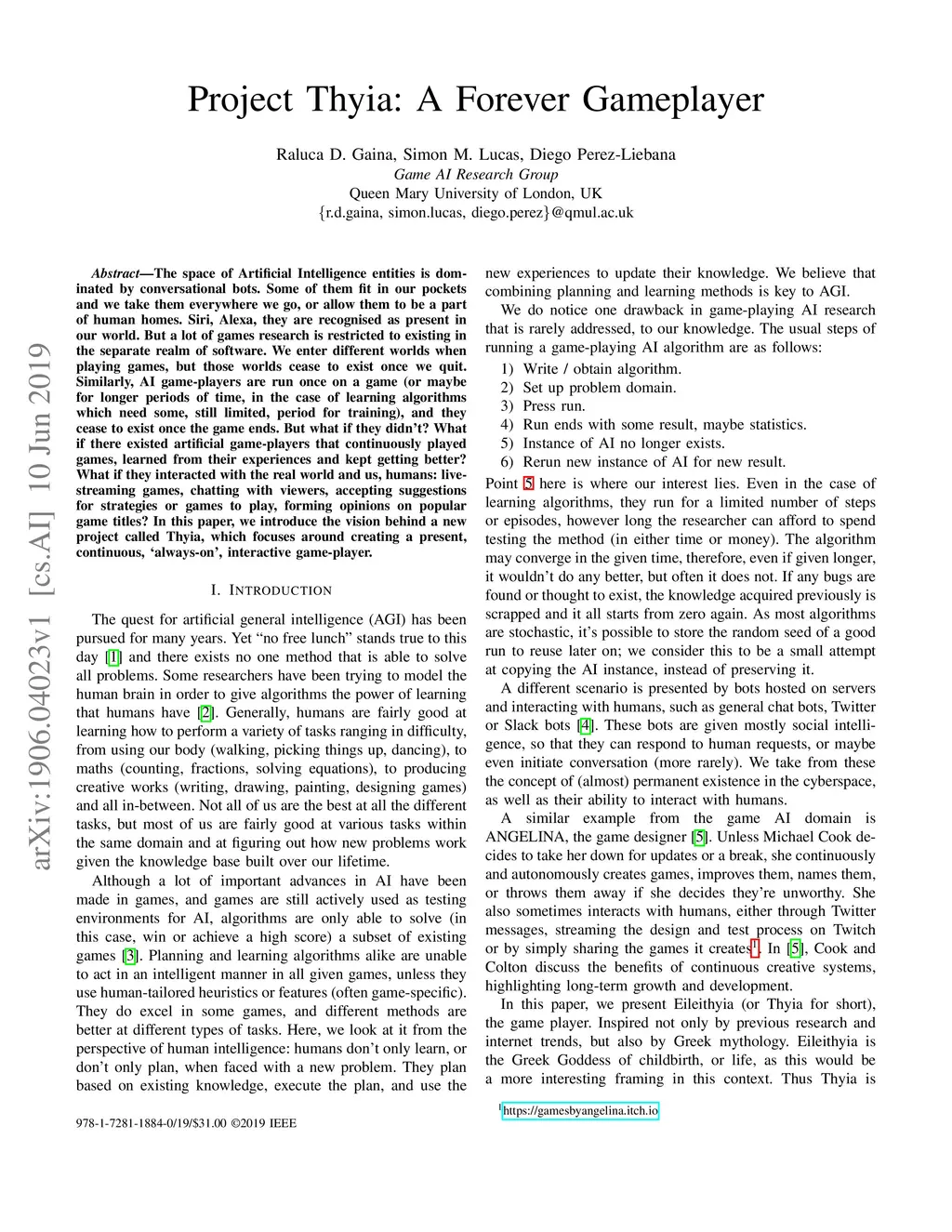 The space of Artificial Intelligence entities is dominated by conversational bots. Some of them fit in our pockets and we take them everywhere we go, or allow them to be a part of human homes. Siri, Alexa, they are recognised as present in our world. But a lot of games research is restricted to existing in the separate realm of software. We enter different worlds when playing games, but those worlds cease to exist once we quit. Similarly, AI game-players are run once on a game (or maybe for longer periods of time, in the case of learning algorithms which need some, still limited, period for training), and they cease to exist once the game ends. But what if they didn't? What if there existed artificial game-players that continuously played games, learned from their experiences and kept getting better? What if they interacted with the real world and us, humans: live-streaming games, chatting with viewers, accepting suggestions for strategies or games to play, forming opinions on popular game titles? In this paper, we introduce the vision behind a new project called Thyia, which focuses around creating a present, continuous, `always-on', interactive game-player.