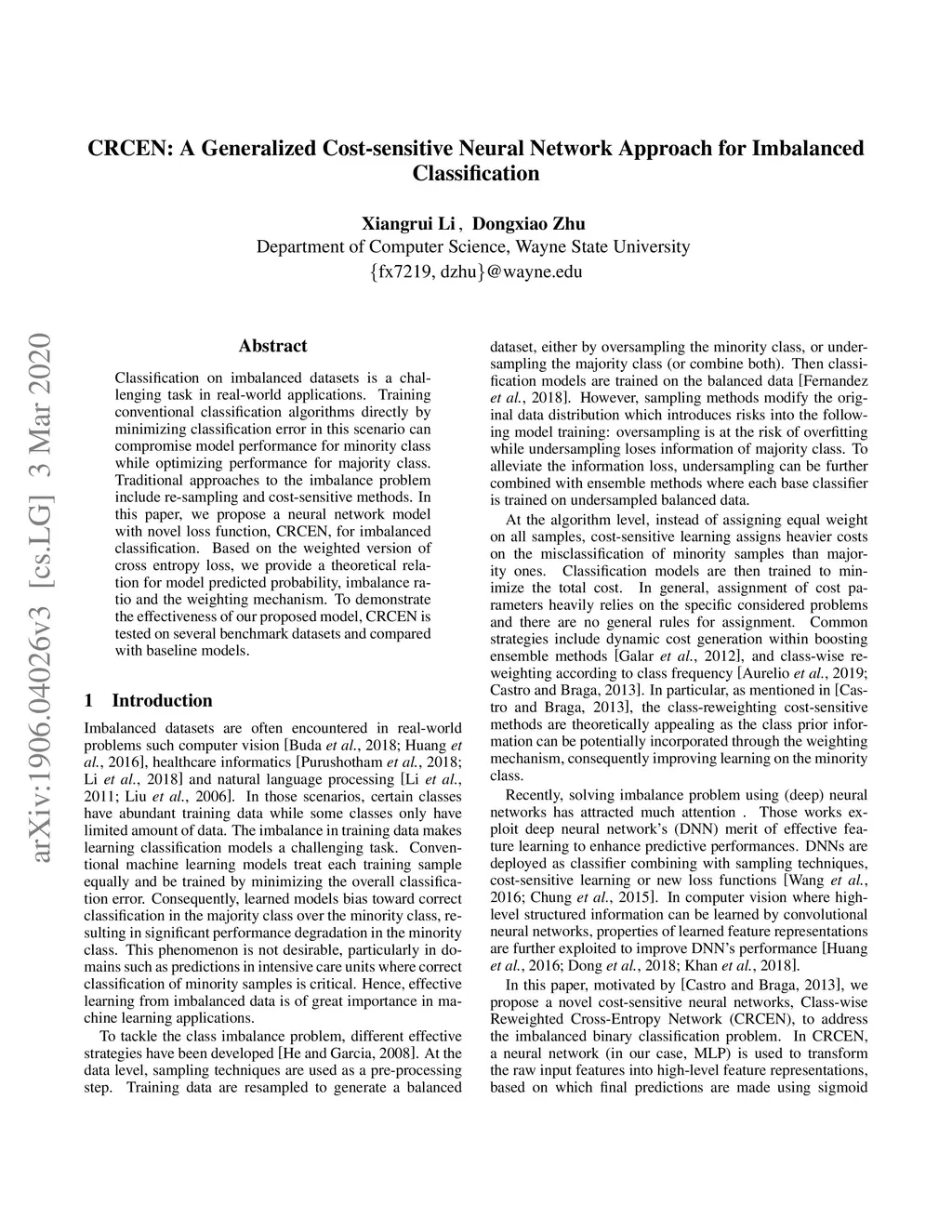 Classification on imbalanced datasets is a challenging task in real-world applications. Training conventional classification algorithms directly by minimizing classification error in this scenario can compromise model performance for minority class while optimizing performance for majority class. Traditional approaches to the imbalance problem include re-sampling and cost-sensitive methods. In this paper, we propose a neural network model with novel loss function, CRCEN, for imbalanced classification. Based on the weighted version of cross entropy loss, we provide a theoretical relation for model predicted probability, imbalance ratio and the weighting mechanism. To demonstrate the effectiveness of our proposed model, CRCEN is tested on several benchmark datasets and compared with baseline models.