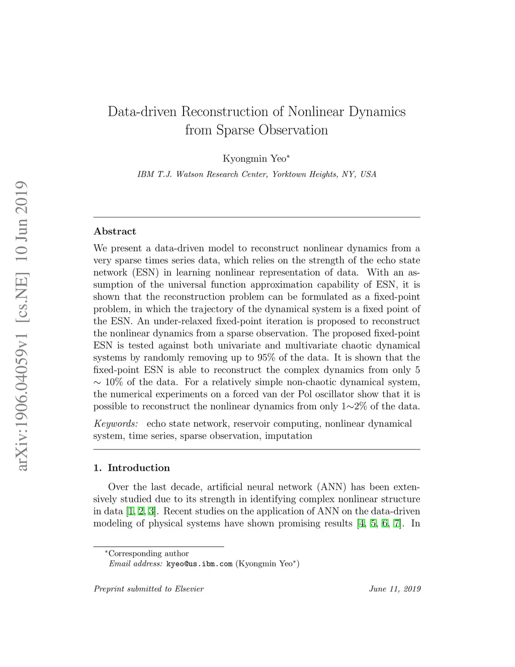 We present a data-driven model to reconstruct nonlinear dynamics from a very sparse times series data, which relies on the strength of the echo state network (ESN) in learning nonlinear representation of data. With an assumption of the universal function approximation capability of ESN, it is shown that the reconstruction problem can be formulated as a fixed-point problem, in which the trajectory of the dynamical system is a fixed point of the ESN. An under-relaxed fixed-point iteration is proposed to reconstruct the nonlinear dynamics from a sparse observation. The proposed fixed-point ESN is tested against both univariate and multivariate chaotic dynamical systems by randomly removing up to 95% of the data. It is shown that the fixed-point ESN is able to reconstruct the complex dynamics from only 5 ~ 10% of the data. For a relatively simple non-chaotic dynamical system, the numerical experiments on a forced van der Pol oscillator show that it is possible to reconstruct the nonlinear dynamics from only 1~2% of the data.