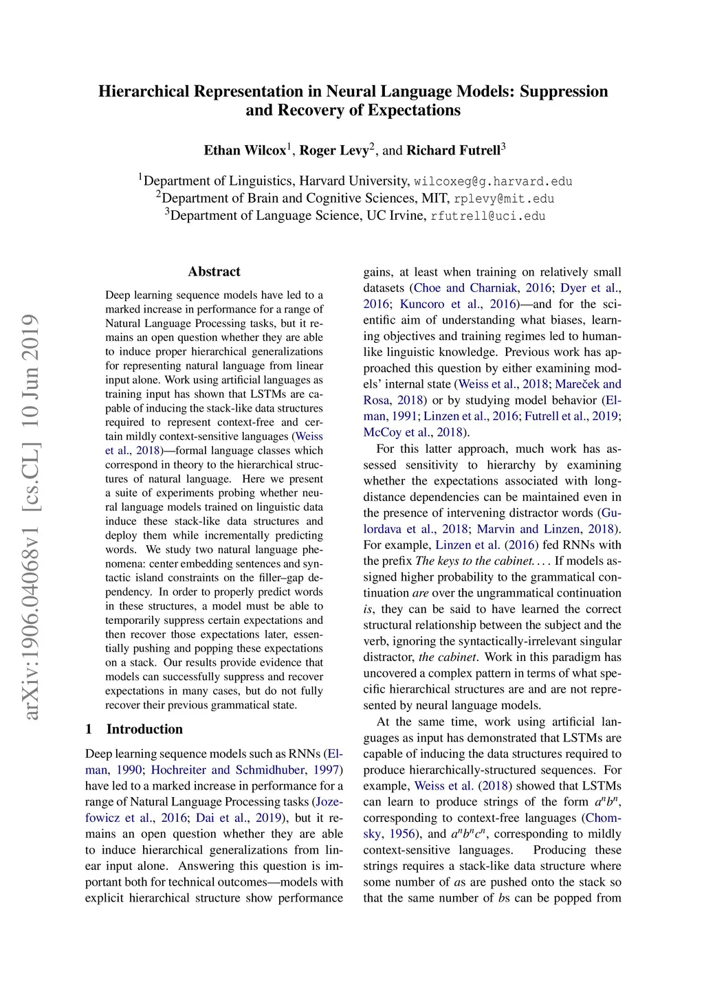 Deep learning sequence models have led to a marked increase in performance for a range of Natural Language Processing tasks, but it remains an open question whether they are able to induce proper hierarchical generalizations for representing natural language from linear input alone. Work using artificial languages as training input has shown that LSTMs are capable of inducing the stack-like data structures required to represent context-free and certain mildly context-sensitive languages---formal language classes which correspond in theory to the hierarchical structures of natural language. Here we present a suite of experiments probing whether neural language models trained on linguistic data induce these stack-like data structures and deploy them while incrementally predicting words. We study two natural language phenomena: center embedding sentences and syntactic island constraints on the filler--gap dependency. In order to properly predict words in these structures, a model must be able to temporarily suppress certain expectations and then recover those expectations later, essentially pushing and popping these expectations on a stack. Our results provide evidence that models can successfully suppress and recover expectations in many cases, but do not fully recover their previous grammatical state.