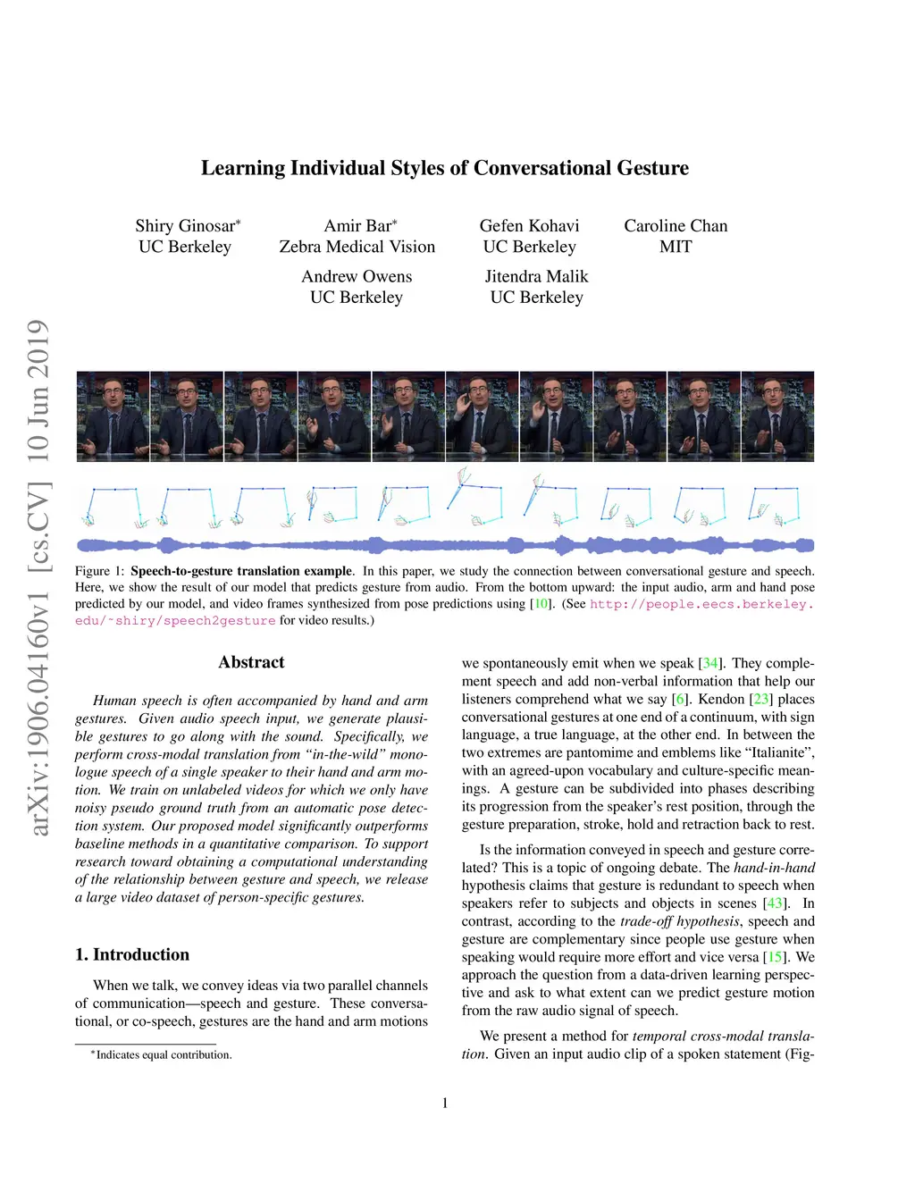 Human speech is often accompanied by hand and arm gestures. Given audio speech input, we generate plausible gestures to go along with the sound. Specifically, we perform cross-modal translation from "in-the-wild'' monologue speech of a single speaker to their hand and arm motion. We train on unlabeled videos for which we only have noisy pseudo ground truth from an automatic pose detection system. Our proposed model significantly outperforms baseline methods in a quantitative comparison. To support research toward obtaining a computational understanding of the relationship between gesture and speech, we release a large video dataset of person-specific gestures. The project website with video, code and data can be found at http://people.eecs.berkeley.edu/~shiry/speech2gesture .