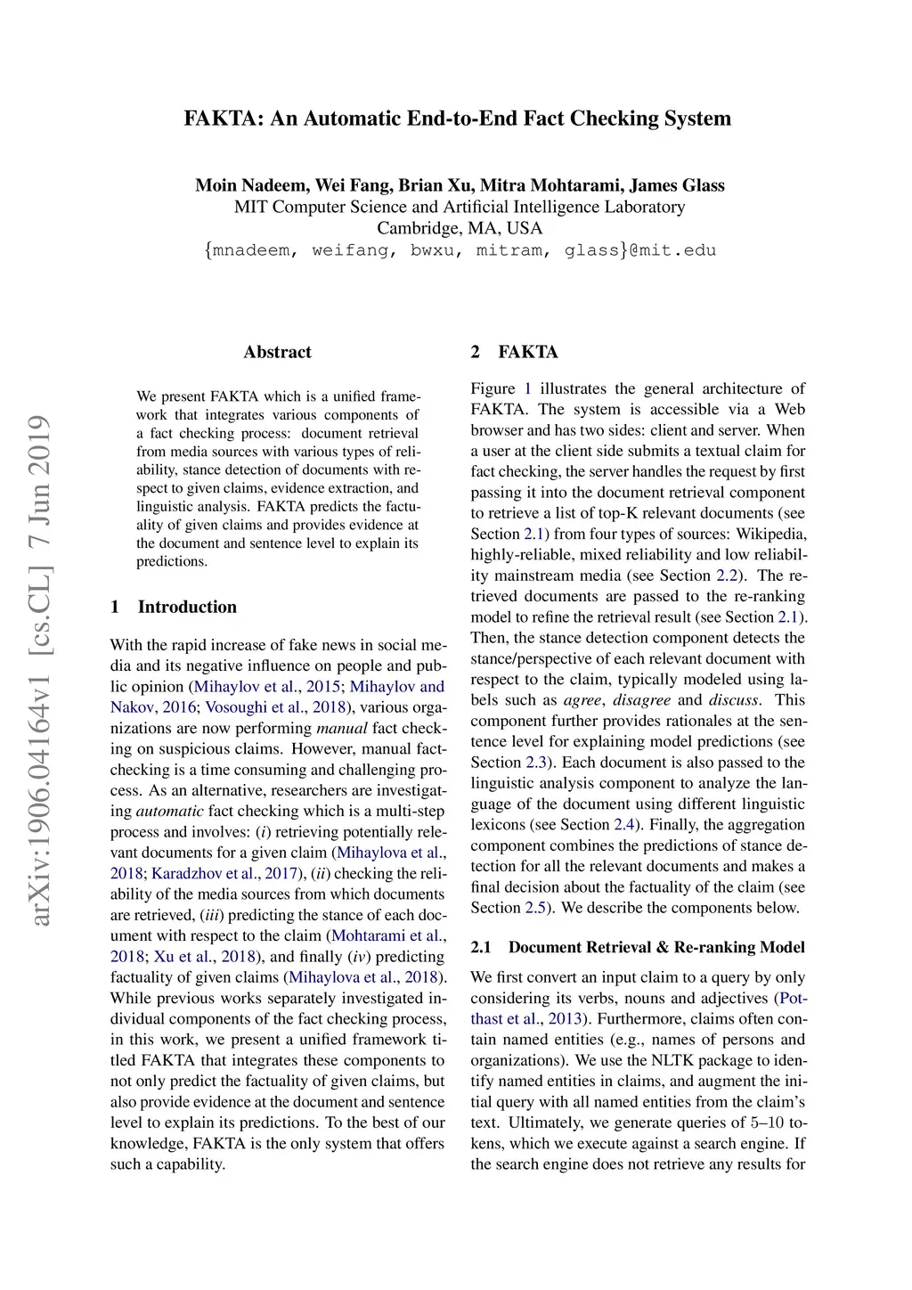 We present FAKTA which is a unified framework that integrates various components of a fact checking process: document retrieval from media sources with various types of reliability, stance detection of documents with respect to given claims, evidence extraction, and linguistic analysis. FAKTA predicts the factuality of given claims and provides evidence at the document and sentence level to explain its predictions