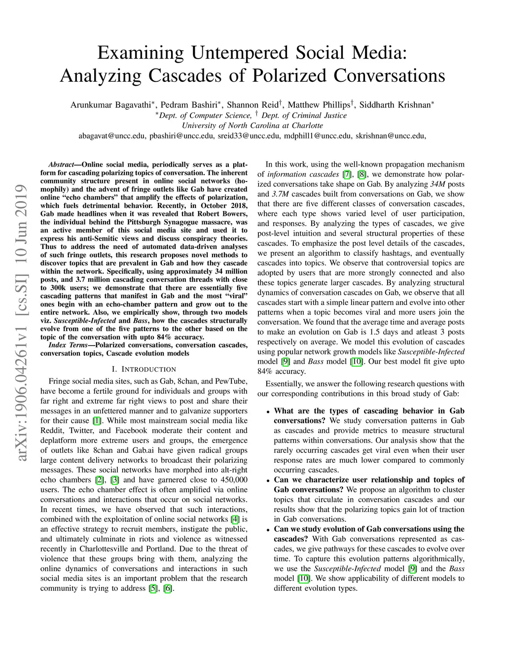 Online social media, periodically serves as a platform for cascading polarizing topics of conversation. The inherent community structure present in online social networks (homophily) and the advent of fringe outlets like Gab have created online "echo chambers" that amplify the effects of polarization, which fuels detrimental behavior. Recently, in October 2018, Gab made headlines when it was revealed that Robert Bowers, the individual behind the Pittsburgh Synagogue massacre, was an active member of this social media site and used it to express his anti-Semitic views and discuss conspiracy theories. Thus to address the need of automated data-driven analyses of such fringe outlets, this research proposes novel methods to discover topics that are prevalent in Gab and how they cascade within the network. Specifically, using approximately 34 million posts, and 3.7 million cascading conversation threads with close to 300k users; we demonstrate that there are essentially five cascading patterns that manifest in Gab and the most "viral" ones begin with an echo-chamber pattern and grow out to the entire network. Also, we empirically show, through two models viz. Susceptible-Infected and Bass, how the cascades structurally evolve from one of the five patterns to the other based on the topic of the conversation with upto 84% accuracy.