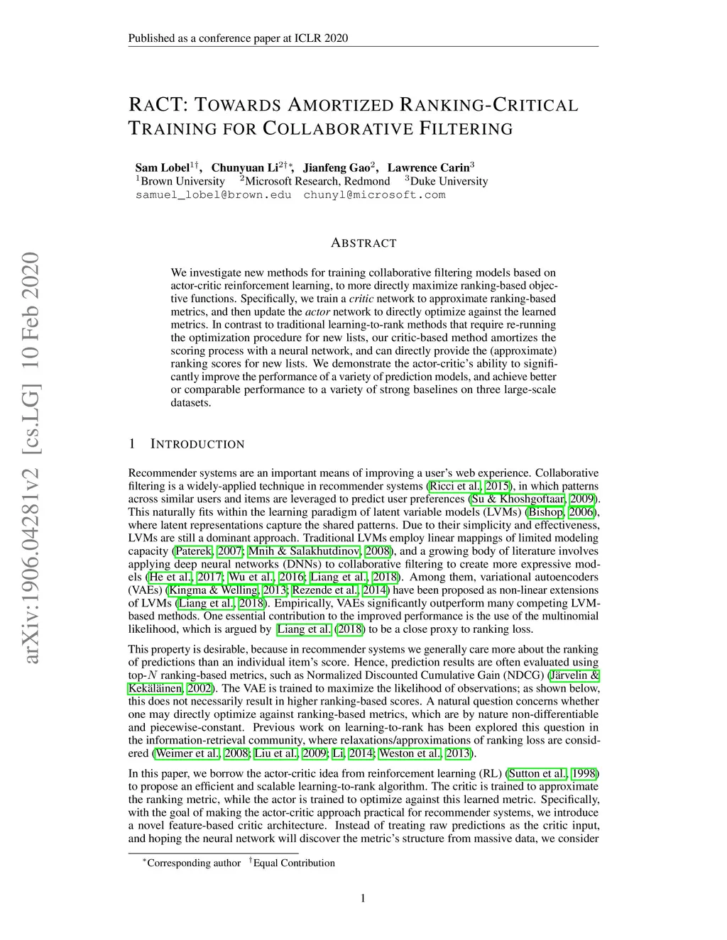 Collaborative filtering is widely used in modern recommender systems. Recent research shows that variational autoencoders (VAEs) yield state-of-the-art performance by integrating flexible representations from deep neural networks into latent variable models, mitigating limitations of traditional linear factor models. VAEs are typically trained by maximizing the likelihood (MLE) of users interacting with ground-truth items. While simple and often effective, MLE-based training does not directly maximize the recommendation-quality metrics one typically cares about, such as top-N ranking. In this paper we investigate new methods for training collaborative filtering models based on actor-critic reinforcement learning, to directly optimize the non-differentiable quality metrics of interest. Specifically, we train a critic network to approximate ranking-based metrics, and then update the actor network (represented here by a VAE) to directly optimize against the learned metrics. In contrast to traditional learning-to-rank methods that require to re-run the optimization procedure for new lists, our critic-based method amortizes the scoring process with a neural network, and can directly provide the (approximate) ranking scores for new lists. Empirically, we show that the proposed methods outperform several state-of-the-art baselines, including recently-proposed deep learning approaches, on three large-scale real-world datasets. The code to reproduce the experimental results and figure plots is on Github: https://github.com/samlobel/RaCT_CF