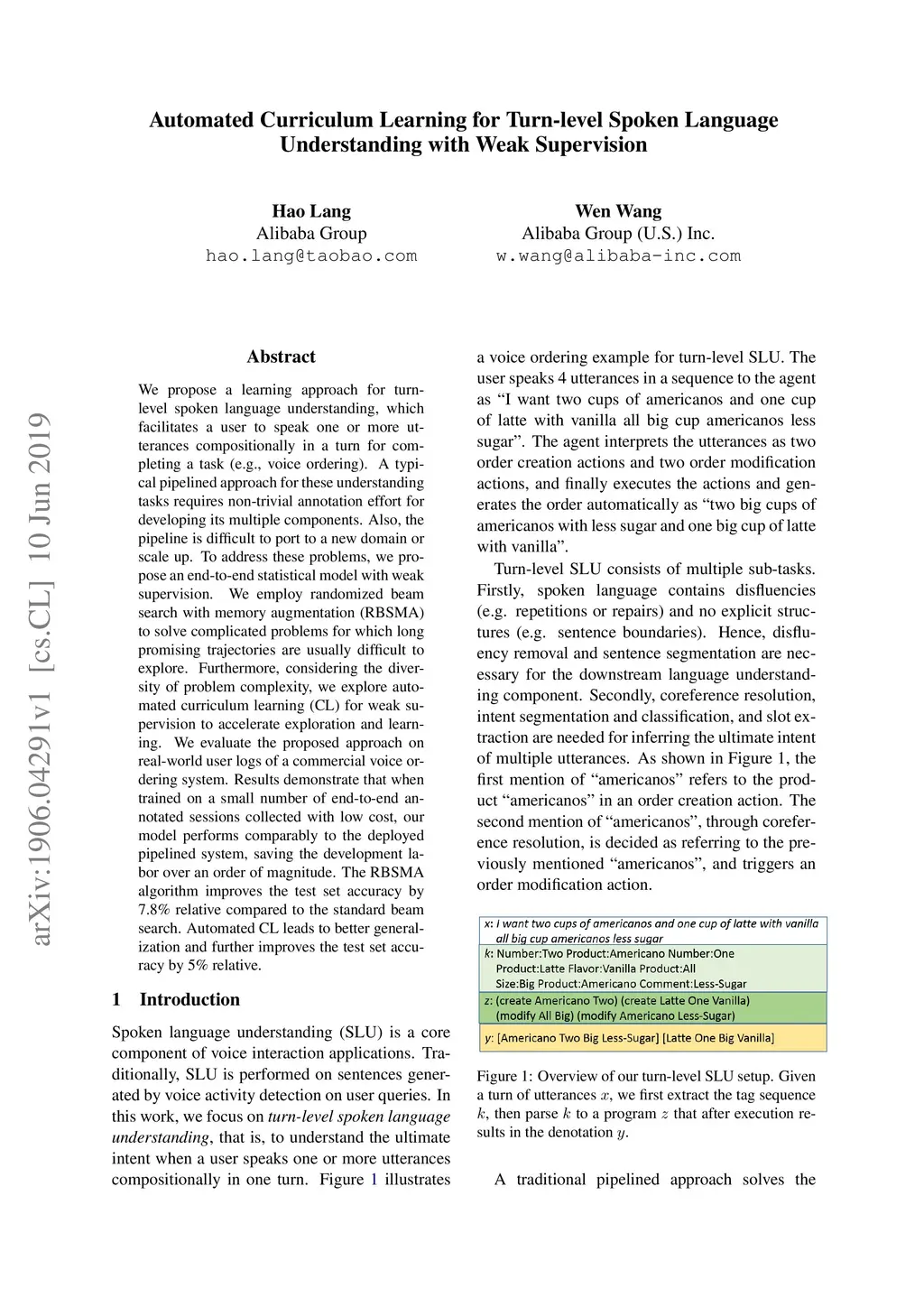 We propose a learning approach for turn-level spoken language understanding, which facilitates a user to speak one or more utterances compositionally in a turn for completing a task (e.g., voice ordering). A typical pipelined approach for these understanding tasks requires non-trivial annotation effort for developing its multiple components. Also, the pipeline is difficult to port to a new domain or scale up. To address these problems, we propose an end-to-end statistical model with weak supervision. We employ randomized beam search with memory augmentation (RBSMA) to solve complicated problems for which long promising trajectories are usually difficult to explore. Furthermore, considering the diversity of problem complexity, we explore automated curriculum learning (CL) for weak supervision to accelerate exploration and learning. We evaluate the proposed approach on real-world user logs of a commercial voice ordering system. Results demonstrate that when trained on a small number of end-to-end annotated sessions collected with low cost, our model performs comparably to the deployed pipelined system, saving the development labor over an order of magnitude. The RBSMA algorithm improves the test set accuracy by 7.8% relative compared to the standard beam search. Automated CL leads to better generalization and further improves the test set accuracy by 5% relative.