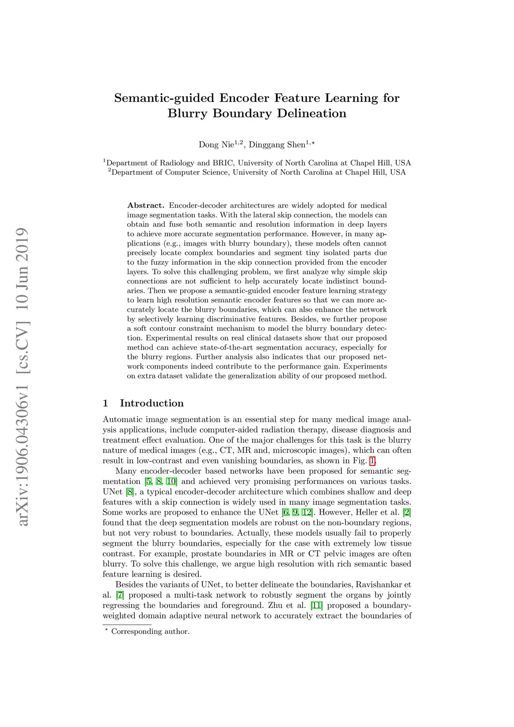 Encoder-decoder architectures are widely adopted for medical image segmentation tasks. With the lateral skip connection, the models can obtain and fuse both semantic and resolution information in deep layers to achieve more accurate segmentation performance. However, in many applications (e.g., blurry boundary images), these models often cannot precisely locate complex boundaries and segment tiny isolated parts. To solve this challenging problem, we firstly analyze why simple skip connections are not enough to help accurately locate indistinct boundaries and argue that it is due to the fuzzy information in the skip connection provided in the encoder layers. Then we propose a semantic-guided encoder feature learning strategy to learn both high resolution and rich semantic encoder features so that we can more accurately locate the blurry boundaries, which can also enhance the network by selectively learning discriminative features. Besides, we further propose a soft contour constraint mechanism to model the blurry boundary detection. Experimental results on real clinical datasets show that our proposed method can achieve state-of-the-art segmentation accuracy, especially for the blurry regions. Further analysis also indicates that our proposed network components indeed contribute to the improvement of performance. Experiments on additional datasets validate the generalization ability of our proposed method.