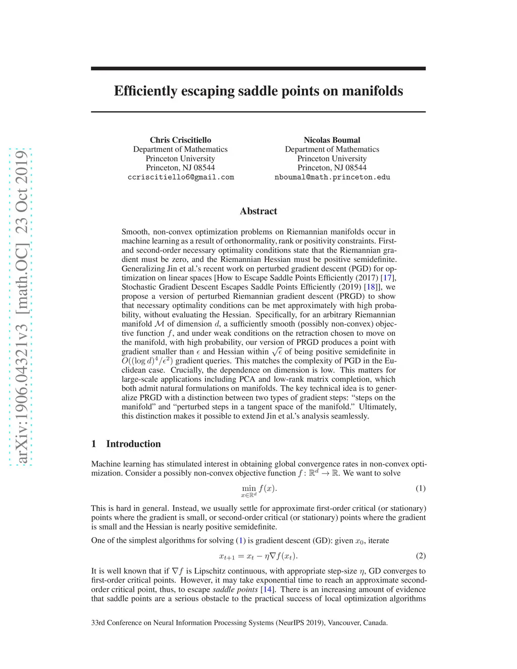 Smooth, non-convex optimization problems on Riemannian manifolds occur in machine learning as a result of orthonormality, rank or positivity constraints. First- and second-order necessary optimality conditions state that the Riemannian gradient must be zero, and the Riemannian Hessian must be positive semidefinite. Generalizing Jin et al.'s recent work on perturbed gradient descent (PGD) for optimization on linear spaces [How to Escape Saddle Points Efficiently (2017), Stochastic Gradient Descent Escapes Saddle Points Efficiently (2019)], we propose a version of perturbed Riemannian gradient descent (PRGD) to show that necessary optimality conditions can be met approximately with high probability, without evaluating the Hessian. Specifically, for an arbitrary Riemannian manifold of dimension , a sufficiently smooth (possibly non-convex) objective function , and under weak conditions on the retraction chosen to move on the manifold, with high probability, our version of PRGD produces a point with gradient smaller than and Hessian within of being positive semidefinite in gradient queries. This matches the complexity of PGD in the Euclidean case. Crucially, the dependence on dimension is low. This matters for large-scale applications including PCA and low-rank matrix completion, which both admit natural formulations on manifolds. The key technical idea is to generalize PRGD with a distinction between two types of gradient steps: "steps on the manifold" and "perturbed steps in a tangent space of the manifold." Ultimately, this distinction makes it possible to extend Jin et al.'s analysis seamlessly.