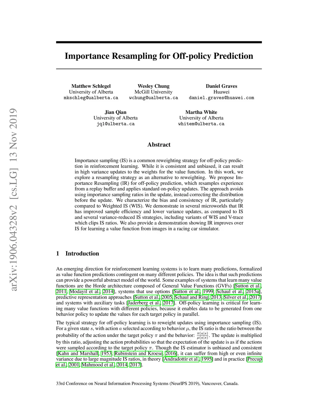 Importance sampling (IS) is a common reweighting strategy for off-policy prediction in reinforcement learning. While it is consistent and unbiased, it can result in high variance updates to the weights for the value function. In this work, we explore a resampling strategy as an alternative to reweighting. We propose Importance Resampling (IR) for off-policy prediction, which resamples experience from a replay buffer and applies standard on-policy updates. The approach avoids using importance sampling ratios in the update, instead correcting the distribution before the update. We characterize the bias and consistency of IR, particularly compared to Weighted IS (WIS). We demonstrate in several microworlds that IR has improved sample efficiency and lower variance updates, as compared to IS and several variance-reduced IS strategies, including variants of WIS and V-trace which clips IS ratios. We also provide a demonstration showing IR improves over IS for learning a value function from images in a racing car simulator.