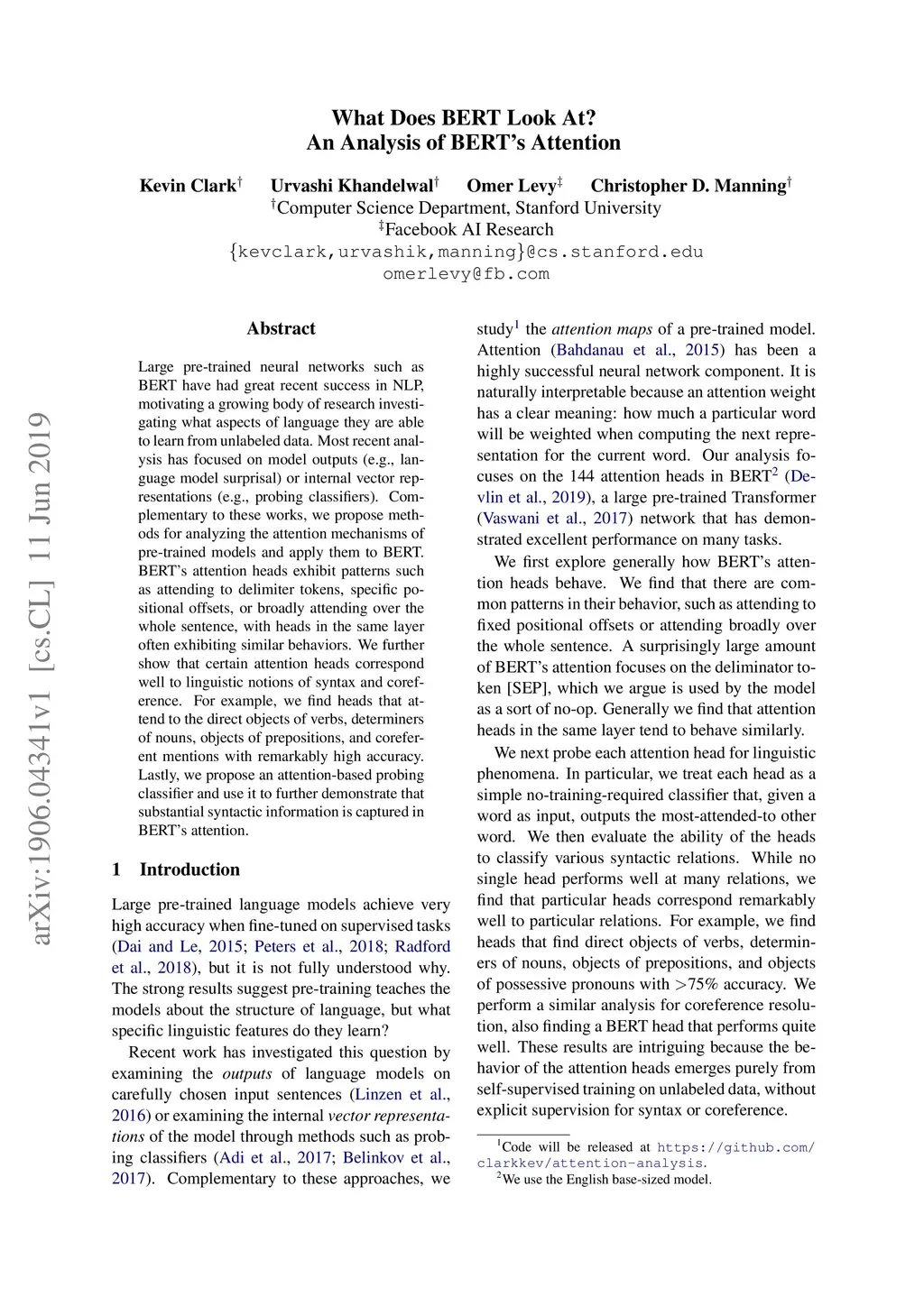Large pre-trained neural networks such as BERT have had great recent success in NLP, motivating a growing body of research investigating what aspects of language they are able to learn from unlabeled data. Most recent analysis has focused on model outputs (e.g., language model surprisal) or internal vector representations (e.g., probing classifiers). Complementary to these works, we propose methods for analyzing the attention mechanisms of pre-trained models and apply them to BERT. BERT's attention heads exhibit patterns such as attending to delimiter tokens, specific positional offsets, or broadly attending over the whole sentence, with heads in the same layer often exhibiting similar behaviors. We further show that certain attention heads correspond well to linguistic notions of syntax and coreference. For example, we find heads that attend to the direct objects of verbs, determiners of nouns, objects of prepositions, and coreferent mentions with remarkably high accuracy. Lastly, we propose an attention-based probing classifier and use it to further demonstrate that substantial syntactic information is captured in BERT's attention.